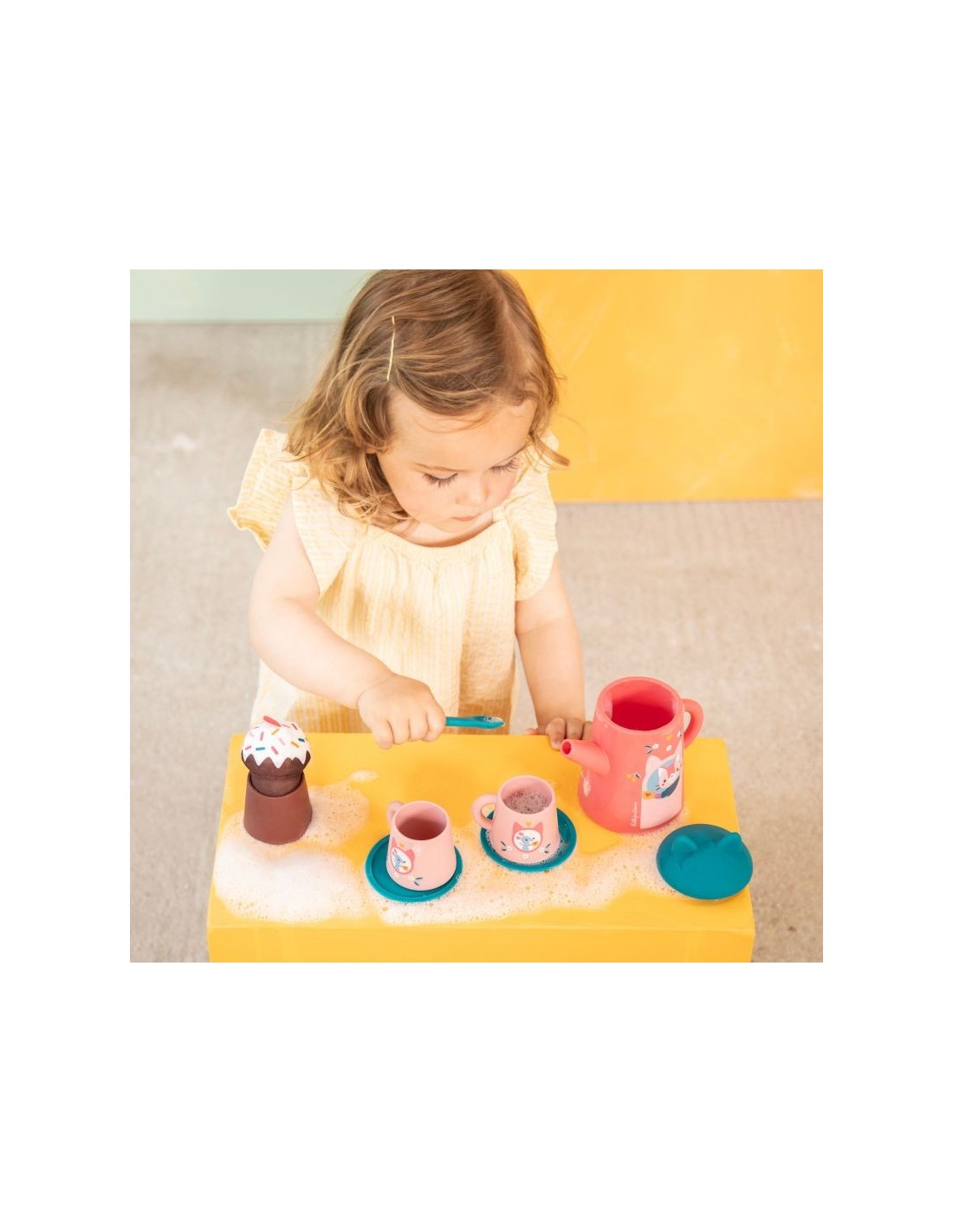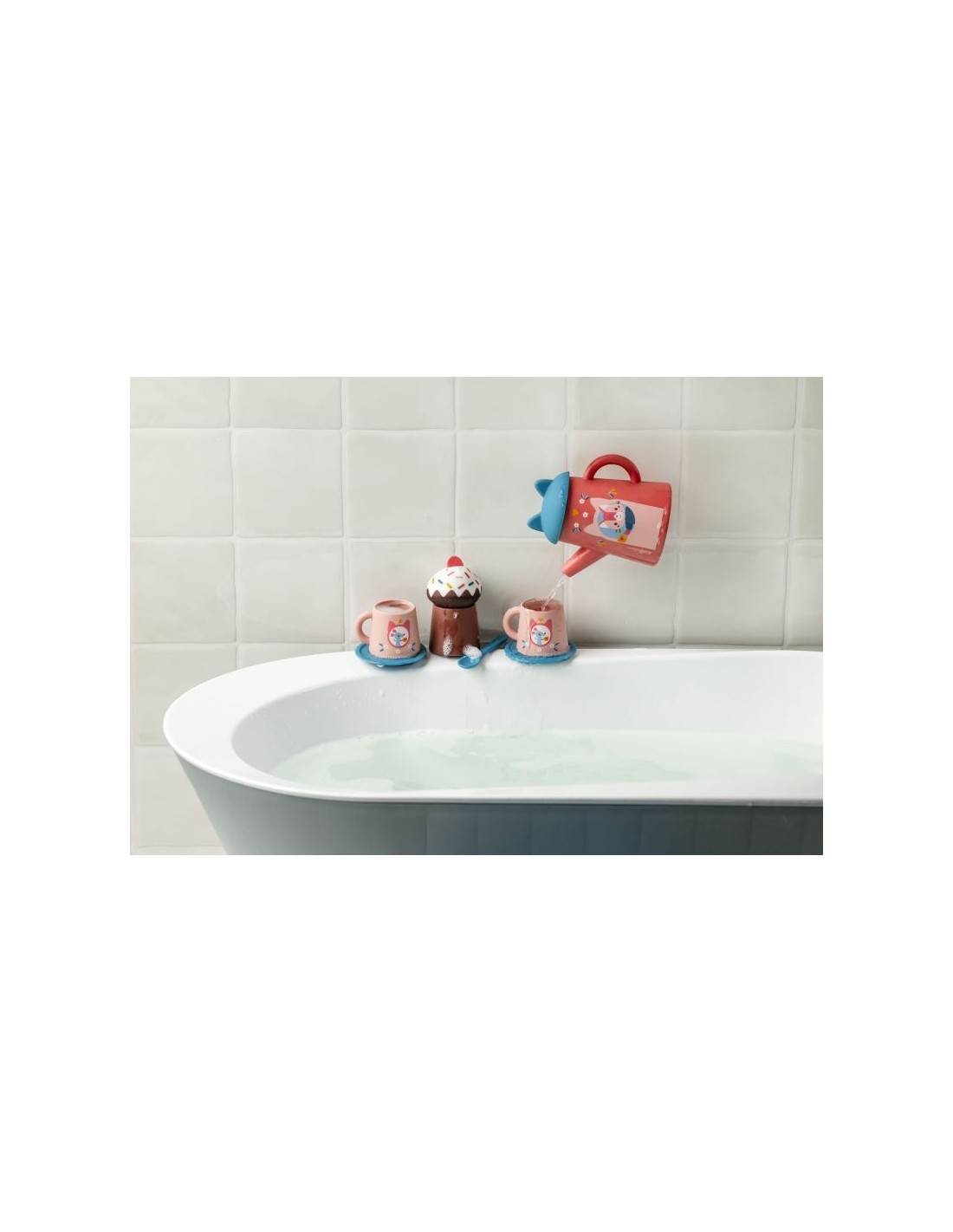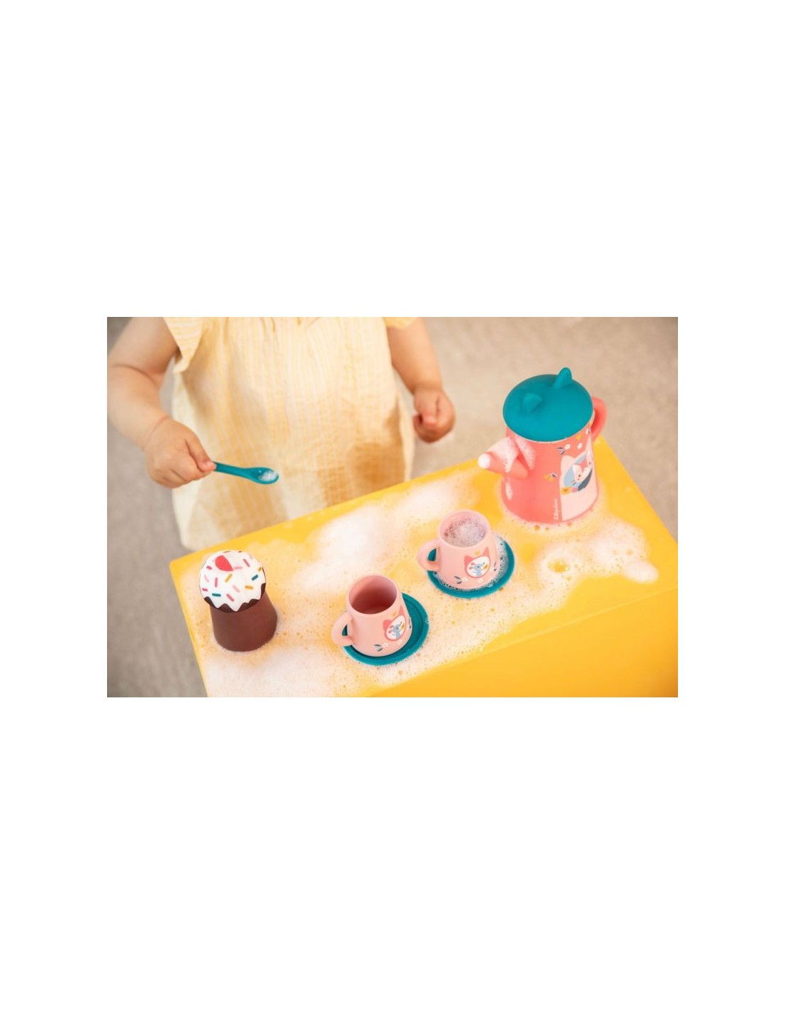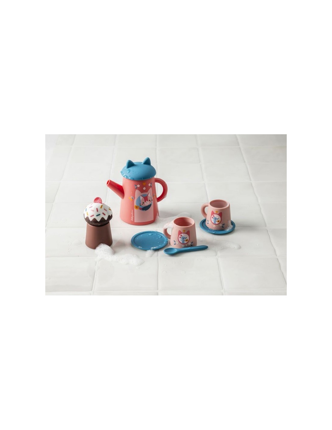 Es hora de una merienda llena de salpicaduras! Con esta adorable tetera con orejas de gato, sus tazas ilustradas con pequeños ratones y sus deliciosos accesorios, el niño inventa una auténtica hora del té acuática. Verter, trasvasar, salpicar ¿y por qué no servir un delicioso muffin? ¡Un juego de imitación ideal para explorar el agua mientras se divierte!