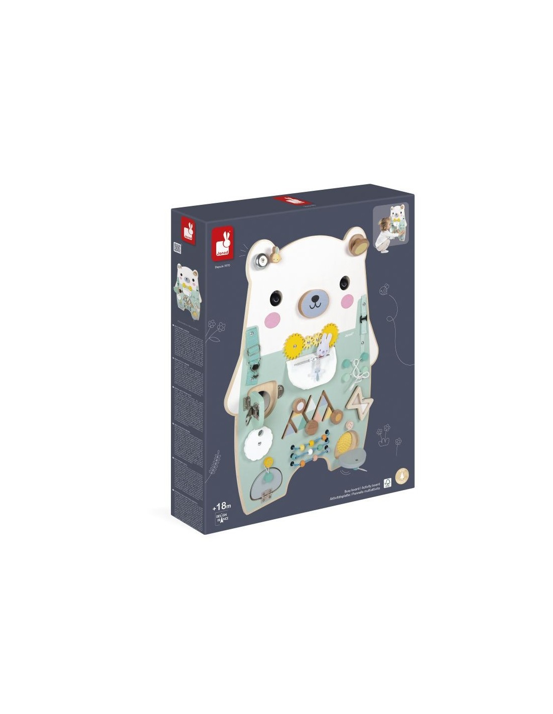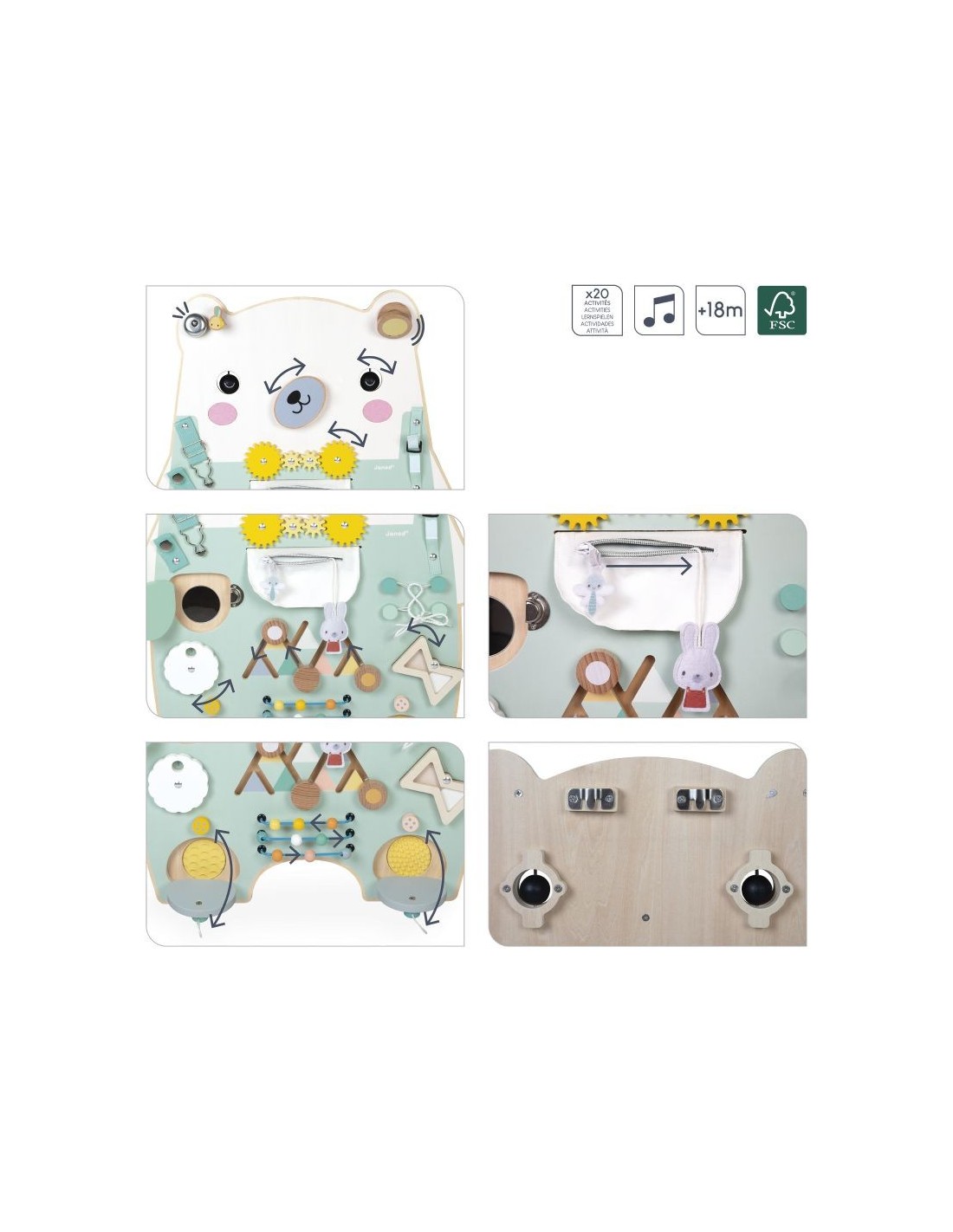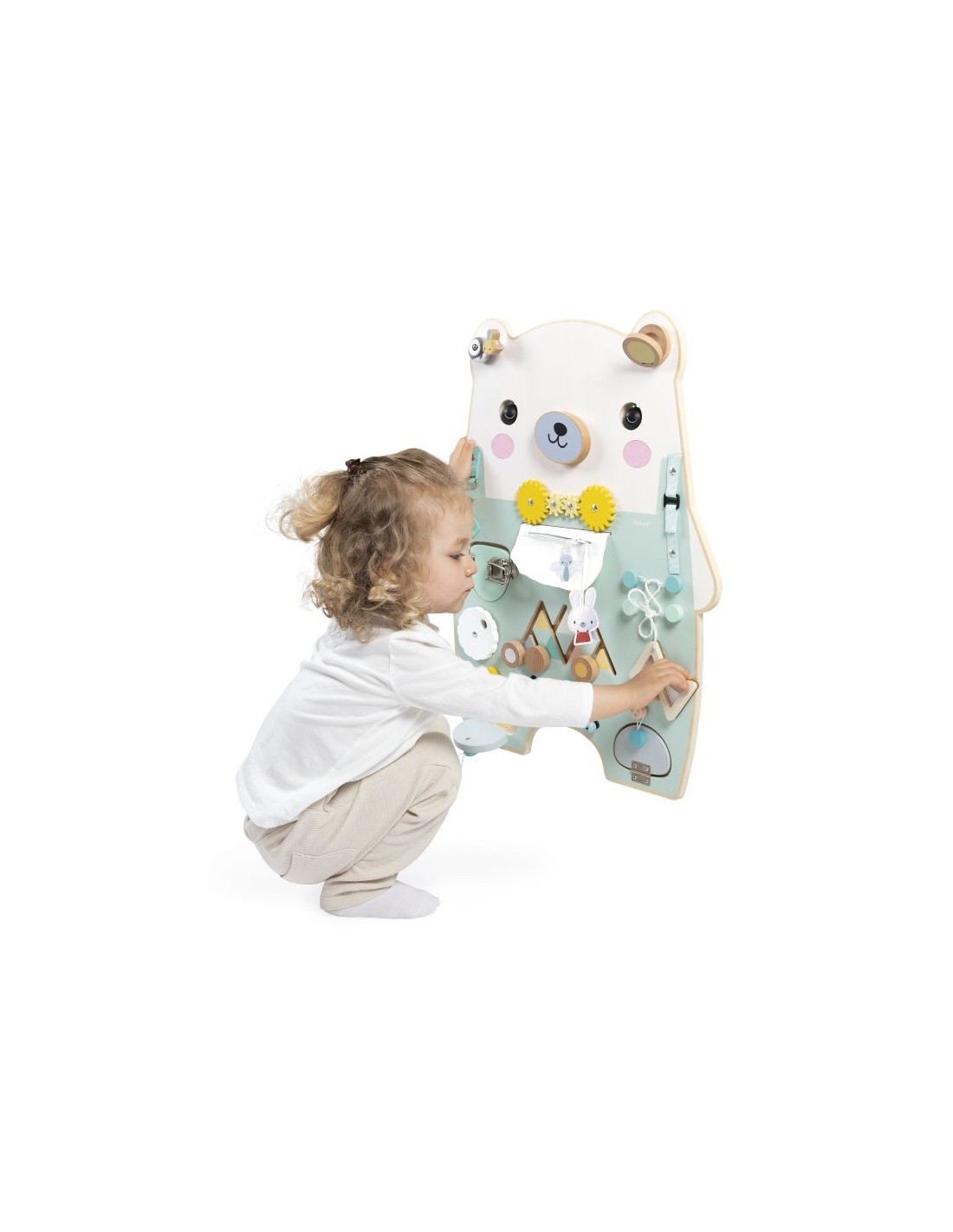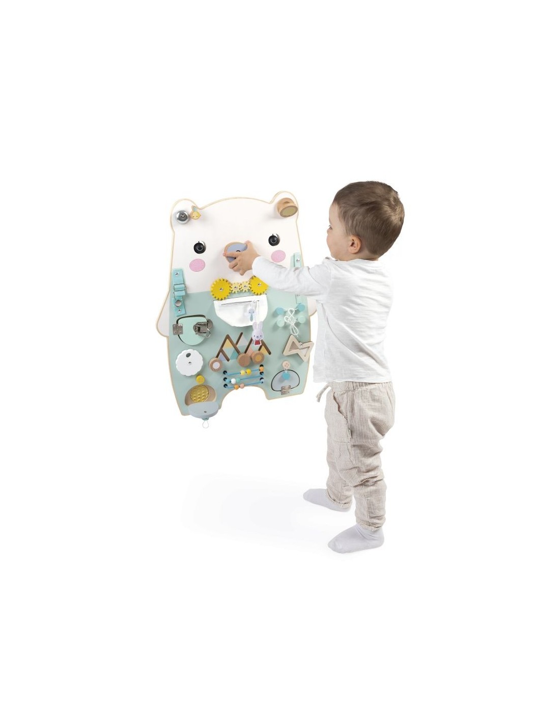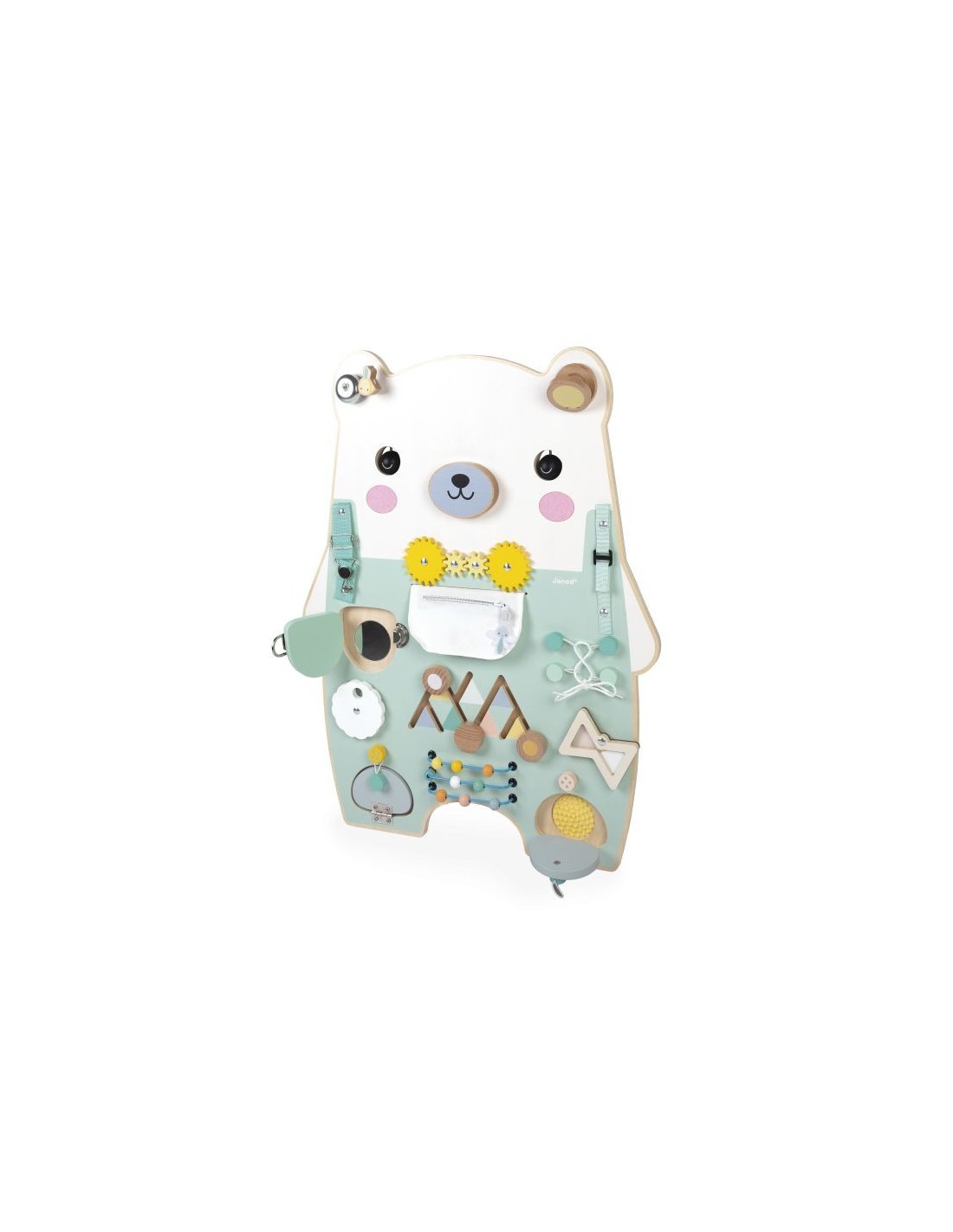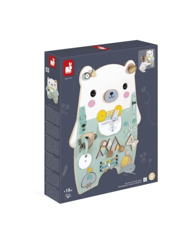 Este bonito y entrañable osito espera impacientemente a su hijo para mostrarle más de 20 actividades! Este juguete completo se compone de: 2 ojos giratorios, coloretes de fieltro, un bolsillo con cremallera que esconde un conejito, un cordón para atar, un reloj de arena giratorio, una rueda que muestra los números del 0 al 9, un laberinto para explorar, un hocico giratorio sonoro, 2 tirantes con diferentes sistemas de cierre, una castañuela, una campanilla, una cerradura metálica, un espejo oculto, un ábaco con bolitas de madera, texturas de silicona ocultas, engranajes, cintas elásticas para sujetar. ¡Horas de descubrimientos aseguradas! Juguete ideal para desarrollar la curiosidad y la motricidad. Juguete de estimulación de madera . Para niños a partir de 18 meses.