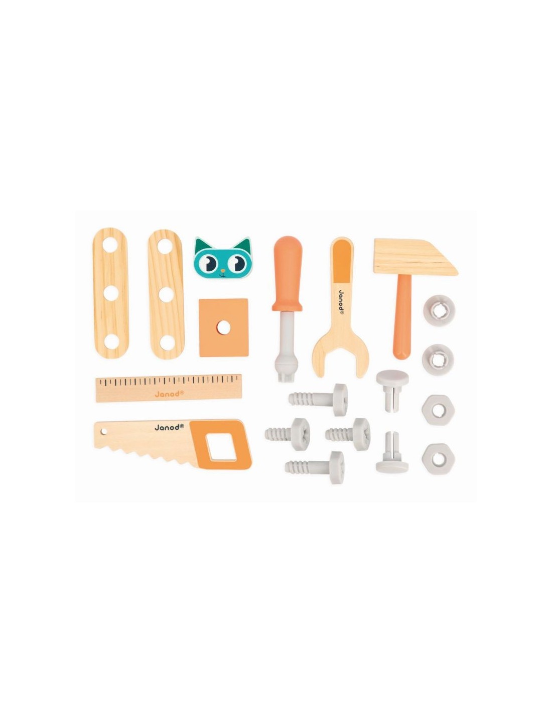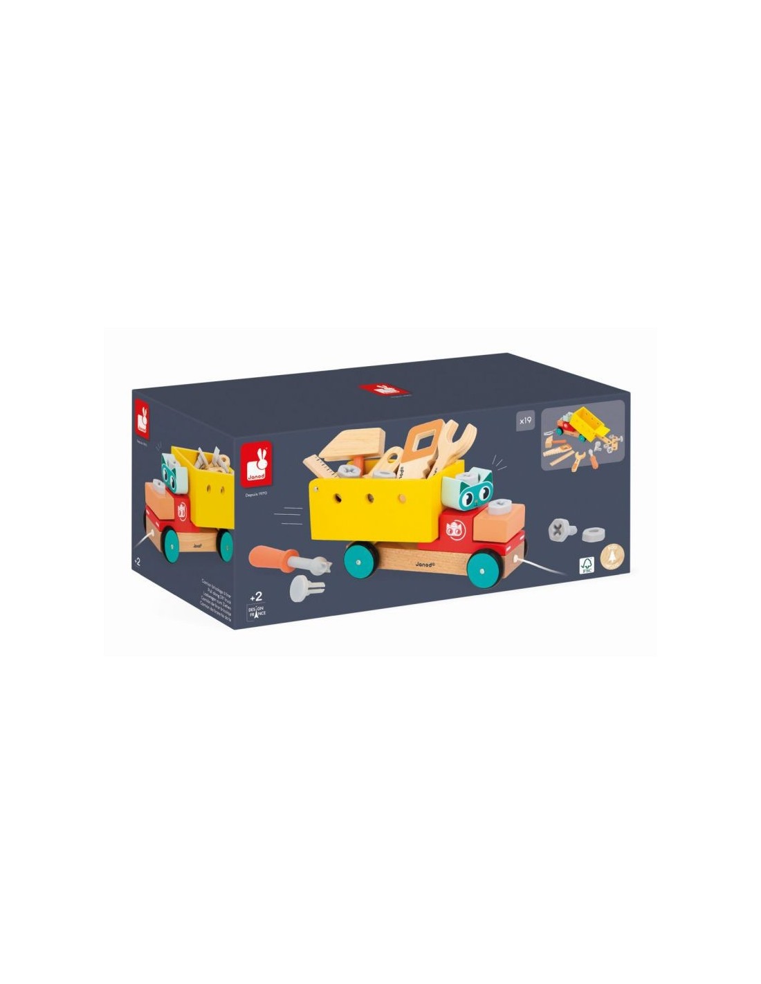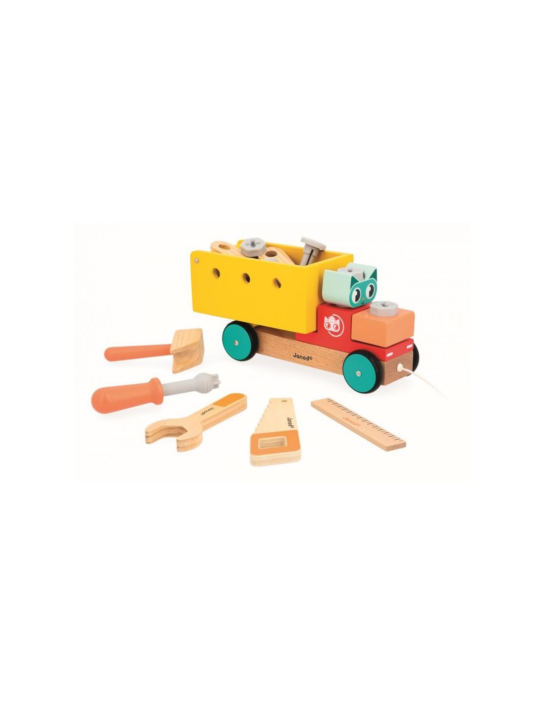 ¡Atención, ha llegado el camión de bricolaje! Este camión 2-en-1 ayudará a su hijo desde los primeros años a aprender a andar, gracias a su cuerda para tirar de él. Además, su lado de construcción permitirá a su hijo desarrollar su destreza y su imaginación. Está compuesto por un remolque que se levanta, 4 accesorios de madera, 10 accesorios de plástico para enroscar y desenroscar una y otra vez, y 5 herramientas para clavar los clavos, medir la superficie de la obra ¡o incluso cortar las tablas! Un pequeño plus: los tornillos tienen muesca para añadir un poco más de jugabilidad y dificultad