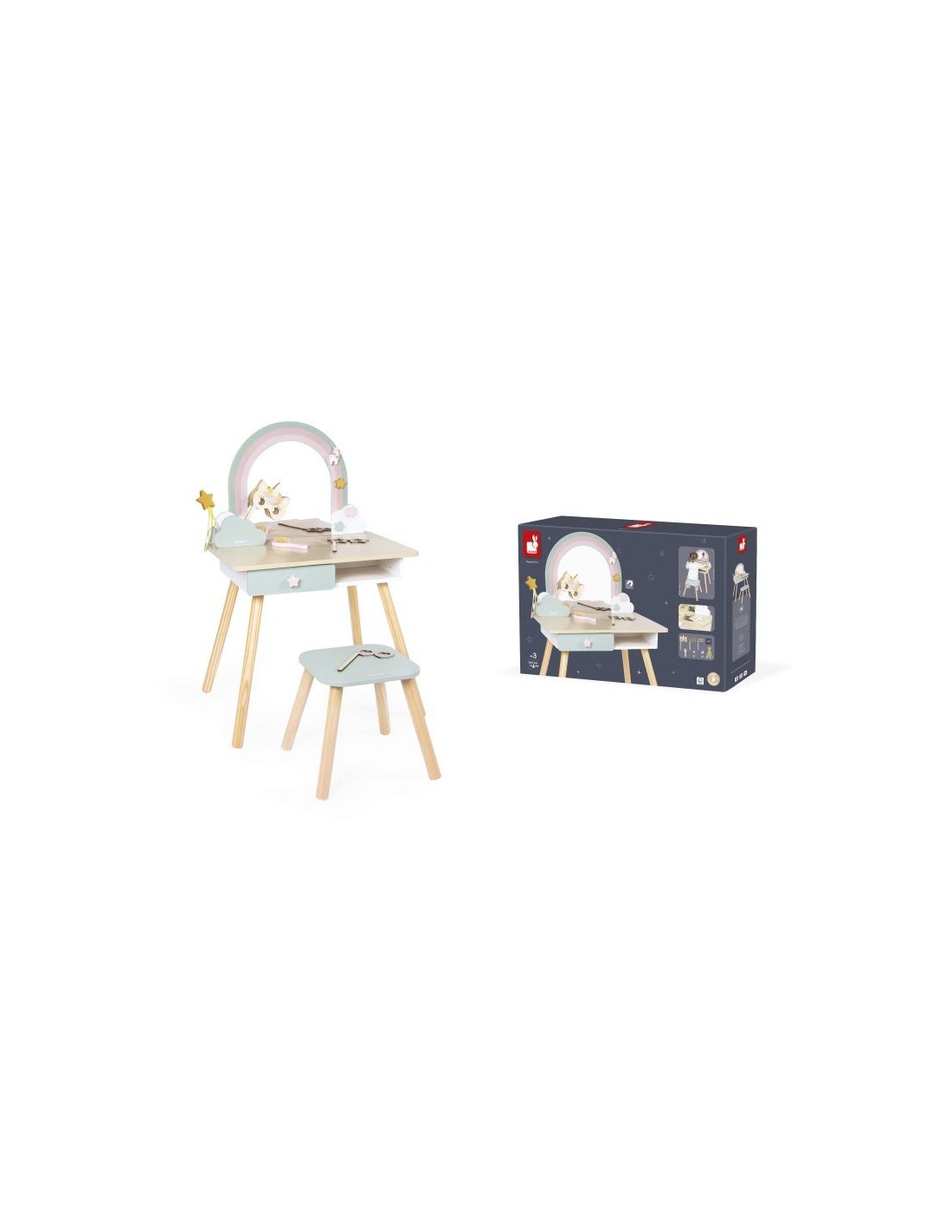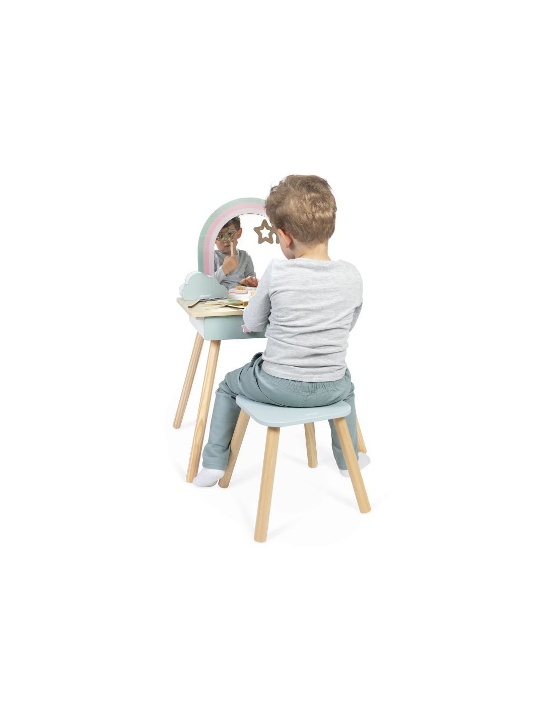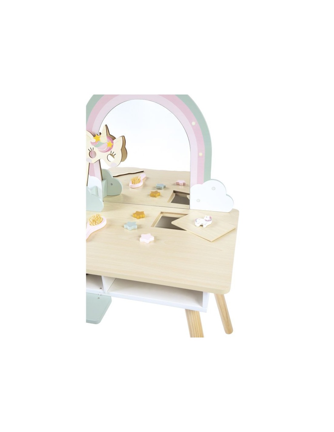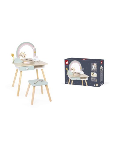 Este gran tocador, su taburete y sus numerosos accesorios ofrecerán a su hijo un auténtico mundo de juego y creatividad. ¡Es mágico! Tiene una trampilla secreta magnética para esconder sus pequeños secretos. ¡También tiene 3 accesorios para fotomatón para pasar horas divirtiéndose! 4 imanes con forma de estrellas y unicornios, un auténtico cepillo del pelo e, incluso, una varita mágica añaden un toque de magia a cada sesión de juego. ¡Con este tocador, su hijo estimulará su imaginación, se arreglará y se divertirá como los mayores!