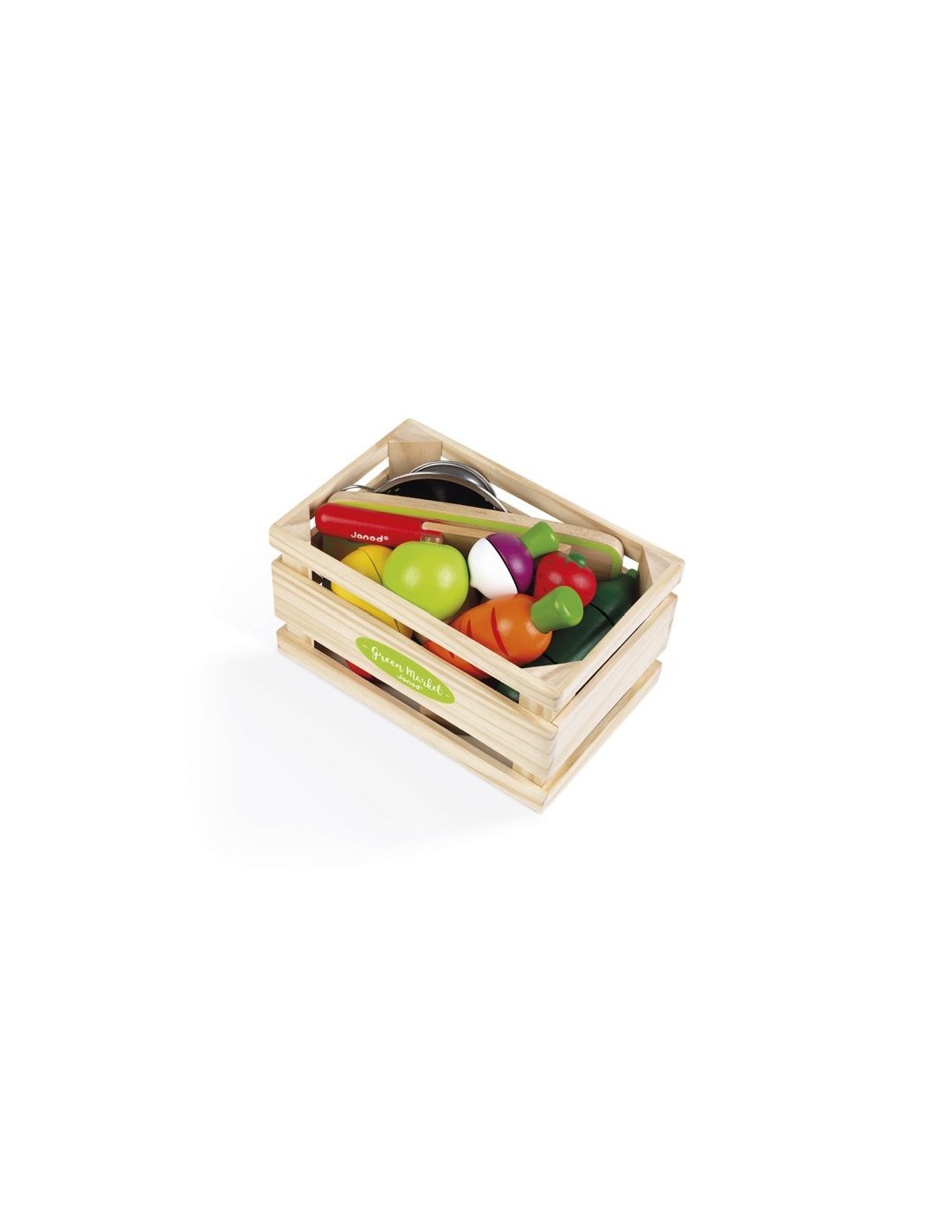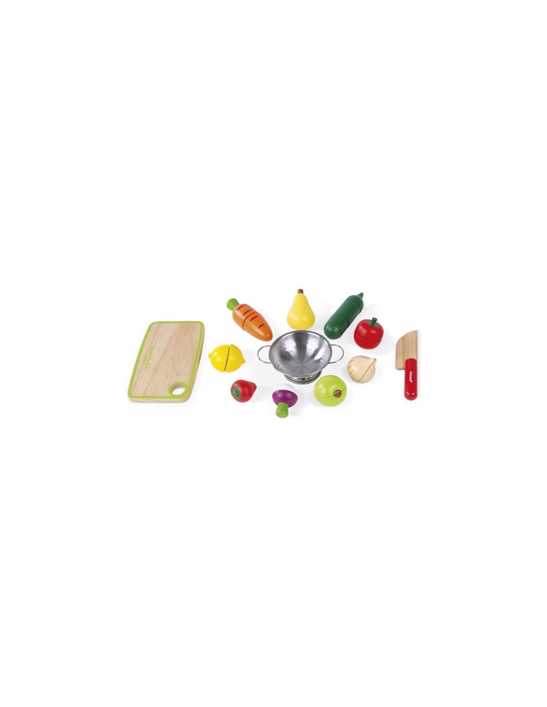 Juguete de madera. Para niños de 3 a 8 años. Esta caja de mercado se compone de 9 frutas y verduras para cortar (cebolla, calabacín, zanahoria, tomate, nabo, pera, limón, manzana y fresa) y una tabla, un cuchillo y un colador... Todo lo necesario para preparar los deliciosos platos imaginados por su hijo.