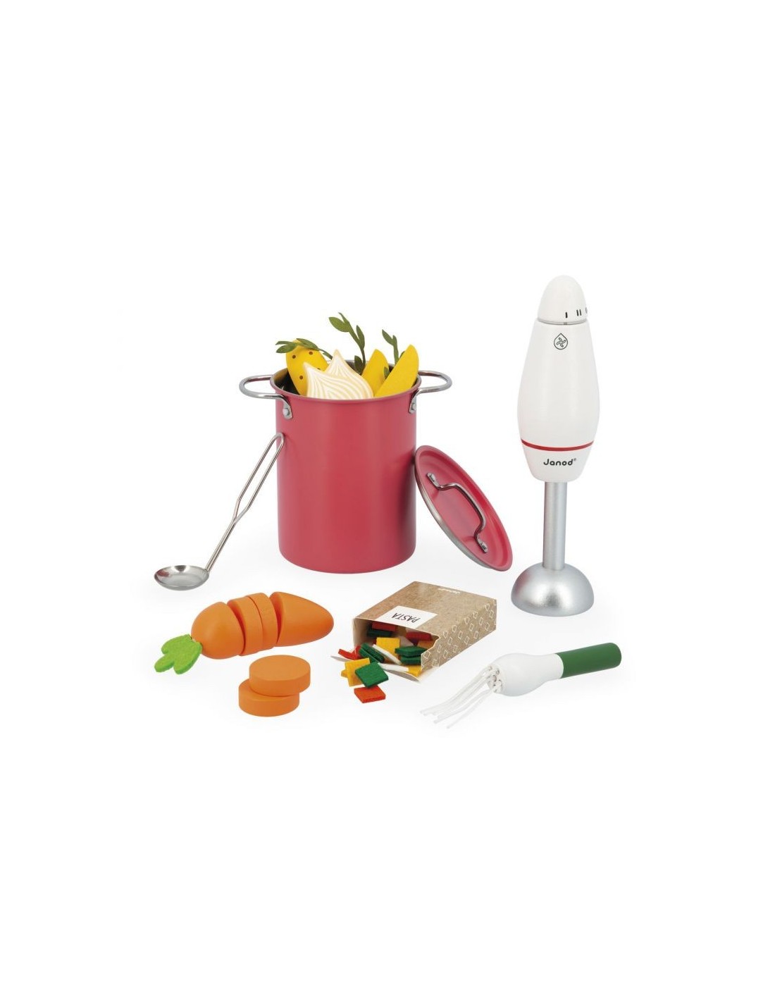 ¡En todo el mundo y a lo largo de la historia, la sopa representa un plato delicioso y reconfortante para grandes y pequeños! Con este set de sopa, su hijo podrá inventar sus propias recetas mientras aprende a cocinar verduras. Este set está compuesto por 43 accesorios: una olla y un cazo de metal, una batidora para batir las verduras, 6 trozos de zanahoria, 2 cebollas, 3 trozos de patata y un puerro de madera, 3 ramitas de hierbas aromáticas de tela y 24 trocitos de pasta de colores guardados en su caja de cartón. ¡Perfecto para elaborar multitud de sopas adaptándose al gusto de cada uno! Con sus accesorios realistas, este set permitirá a su hijo inventar magníficos platos y hacer como los mayores: crear momentos para compartir alrededor de la mesa.