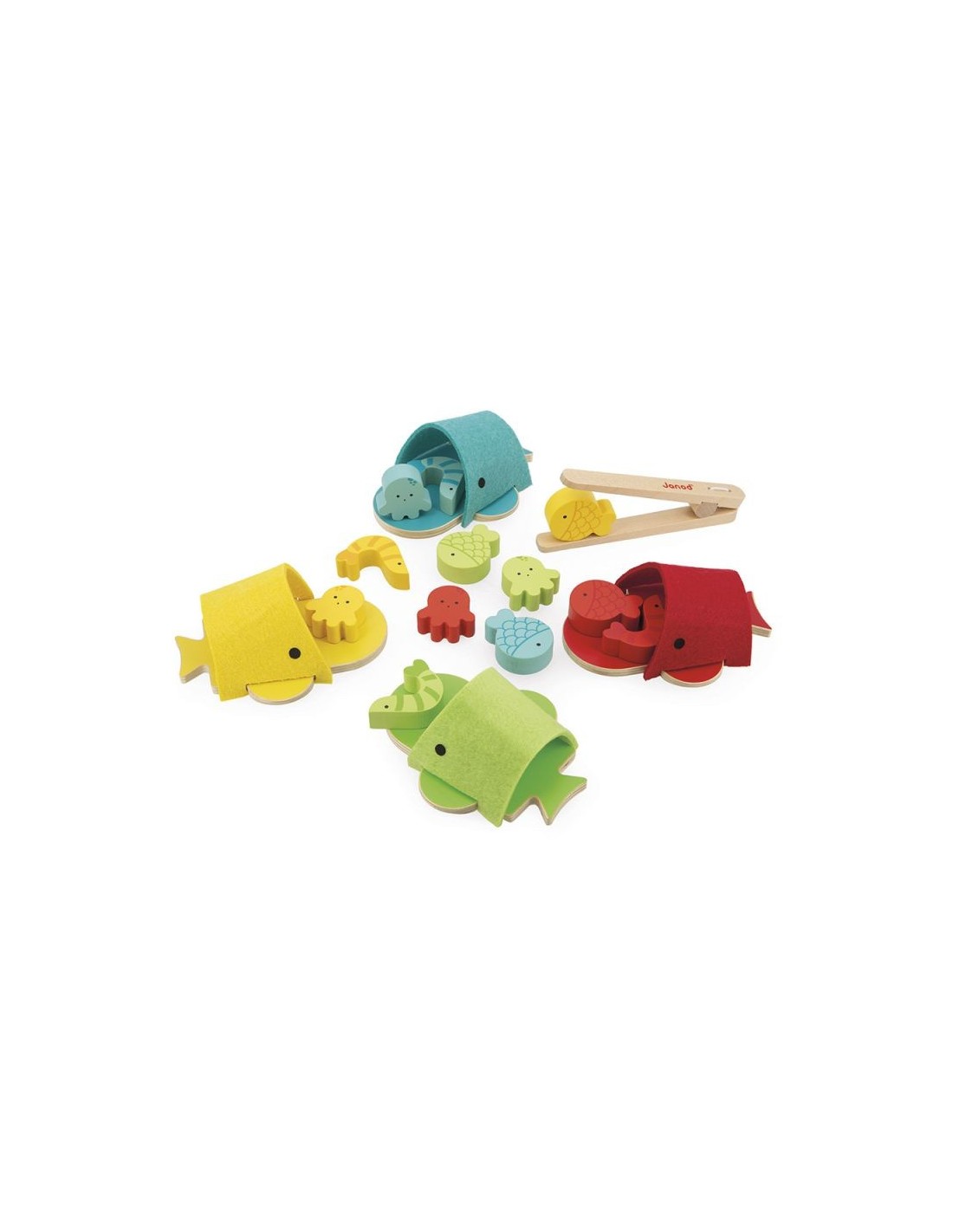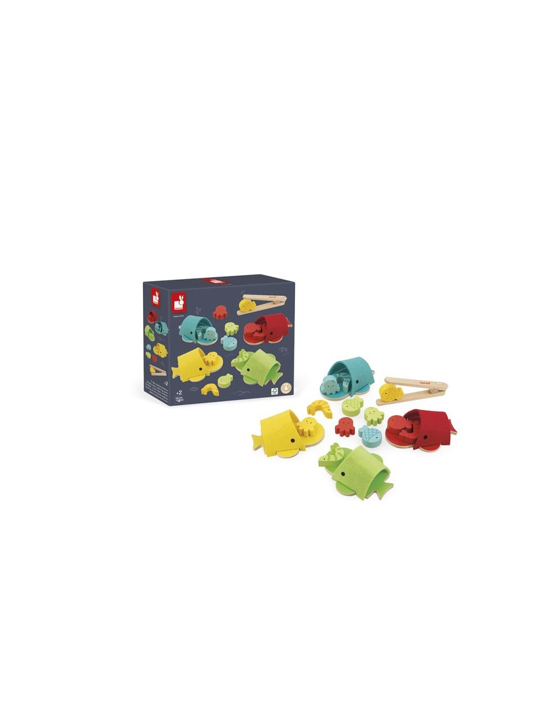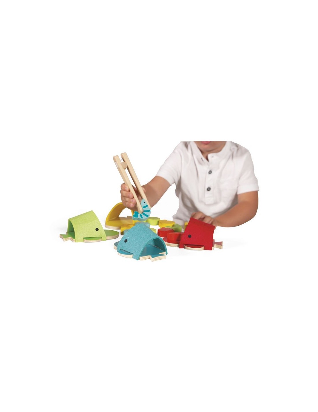 ¡Azul, amarillo o rojo! Hay tantos colores por descubrir. Con la ayuda de las pinzas de madera, el niño tendrá que unir los animales marinos a las ballenas del mismo color. Un juego lúdico y educativo que permitirá al niño familiarizarse con las formas y los colores mientras desarrolla su motricidad fina. Juguete de estímulo para niños a partir de 2 años.