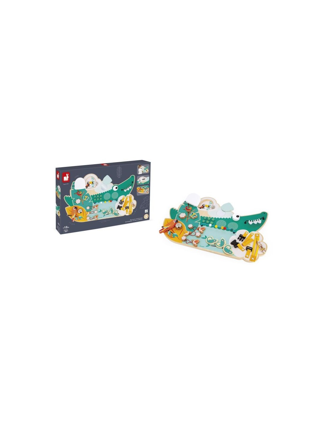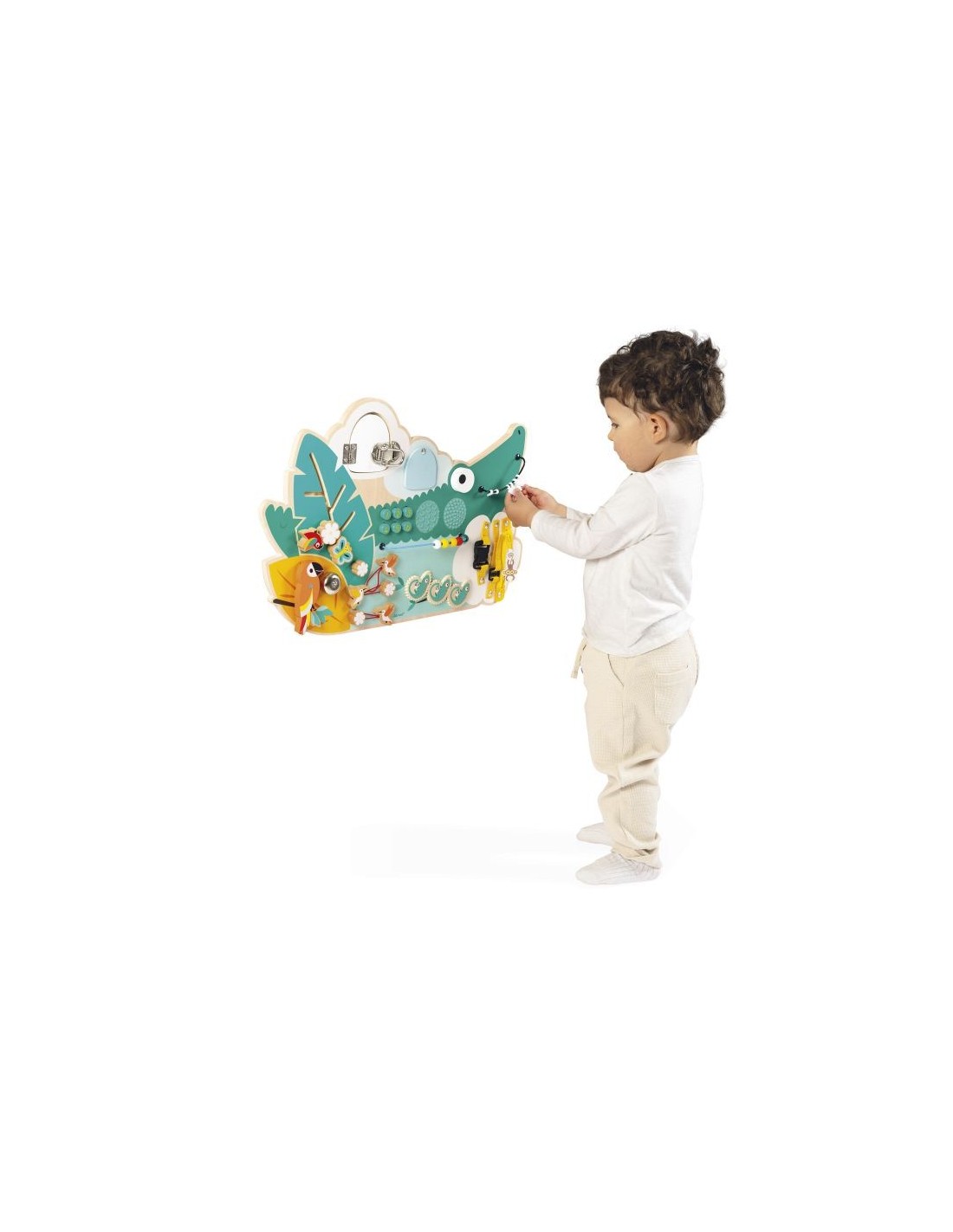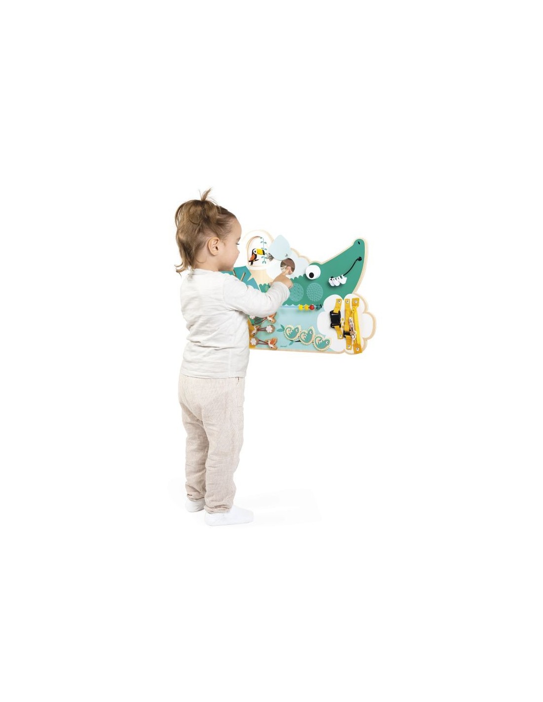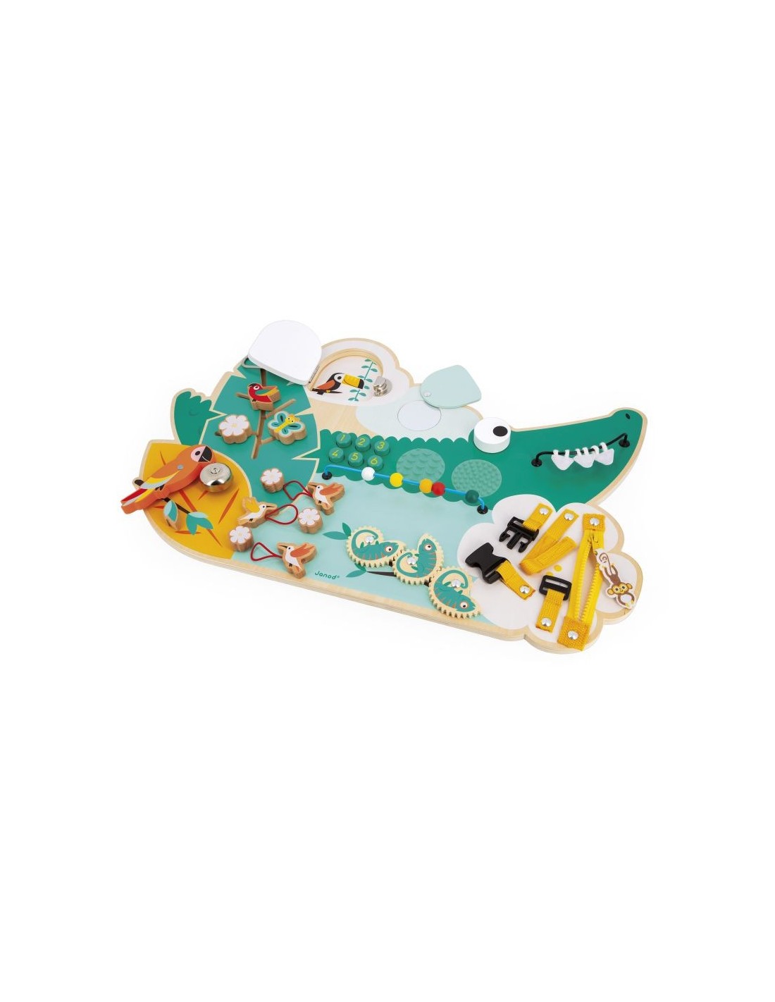 ¡Escondido en medio de la jungla, el cocodrilo Croco está esperando a su hijo para jugar y mostrarle más de 14 actividades! Este juguete completo se compone de: un laberinto para manipular, un ojo giratorio sonoro, 3 correas con diferentes sistemas de cierre, engranajes de camaleones, una campanilla, una cerradura metálica, un espejo oculto, un ábaco con bolitas de madera, texturas de silicona, botones para pulsar, cintas elásticas para sujetar, fieltro para tocar. ¡Horas de descubrimientos aseguradas! Juguete ideal para desarrollar la curiosidad y la motricidad. Juguete de estimulación de madera FSCTM. Para niños a partir de 18 meses.