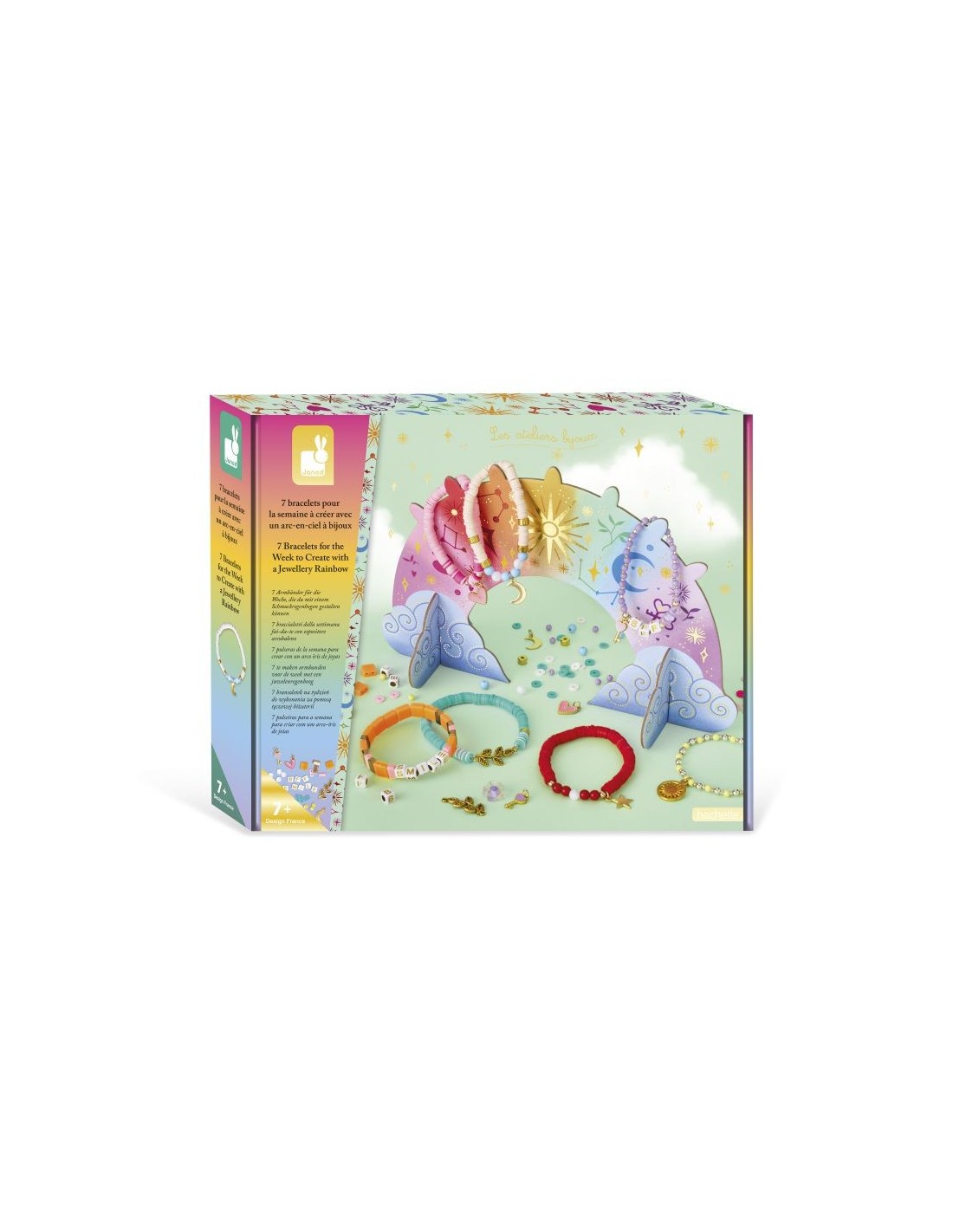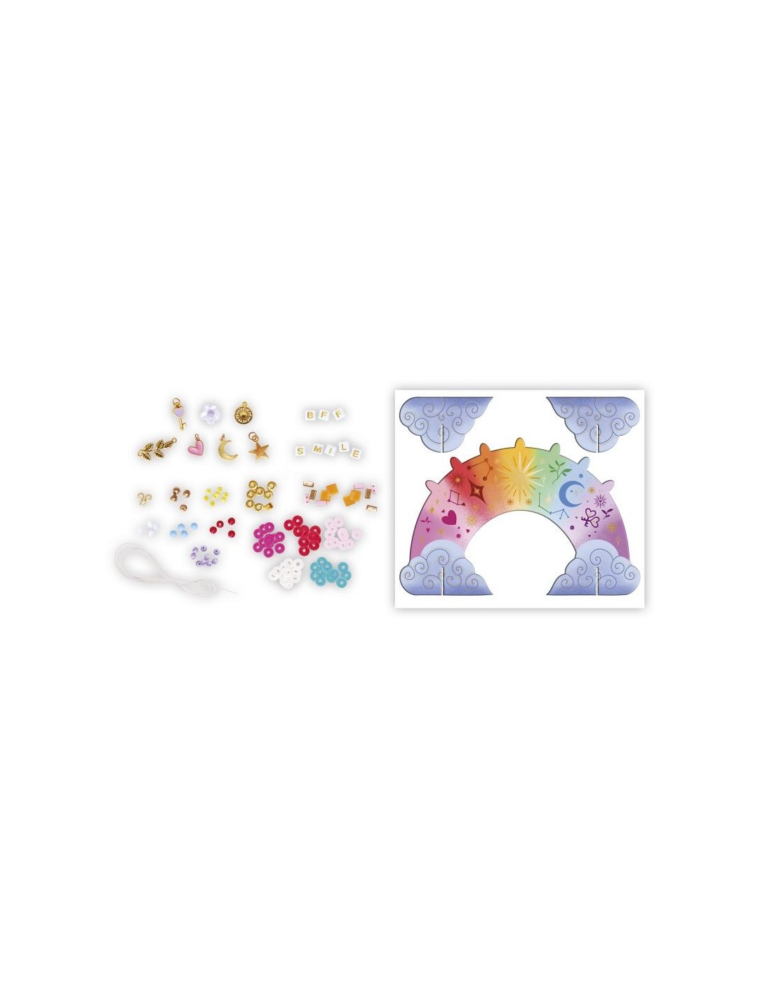 ¡Una pulsera para cada día de la semana! El contenido de este kit creativo permite hacer 7 pulseras, cada una asociada con un color y una energía. Además, una vez confeccionadas, se pueden exponer todas en un bonito arcoíris. ¡Y ya solo queda elegir una pulsera según la energía que necesites al levantarte cada mañana! La caja contiene 6 colgantes (estrella, luna, corazón, sol, hoja y llave), 77 cuentas de rocalla, 50 abalorios acrílicos, 4 cuentas de piedra lunar, 22 abalorios metálicos, 470 cuentas heishi (cuentas planas finas), 22 abalorios cuadrados, 8 cuentas de letras, 1 cuenta flor, 8 arandelas, cordón elástico y 1 cuadernillo con instrucciones y modelos. Esta actividad permite desarrollar la paciencia y la creatividad. Es ideal para niños a partir de 7 años.
