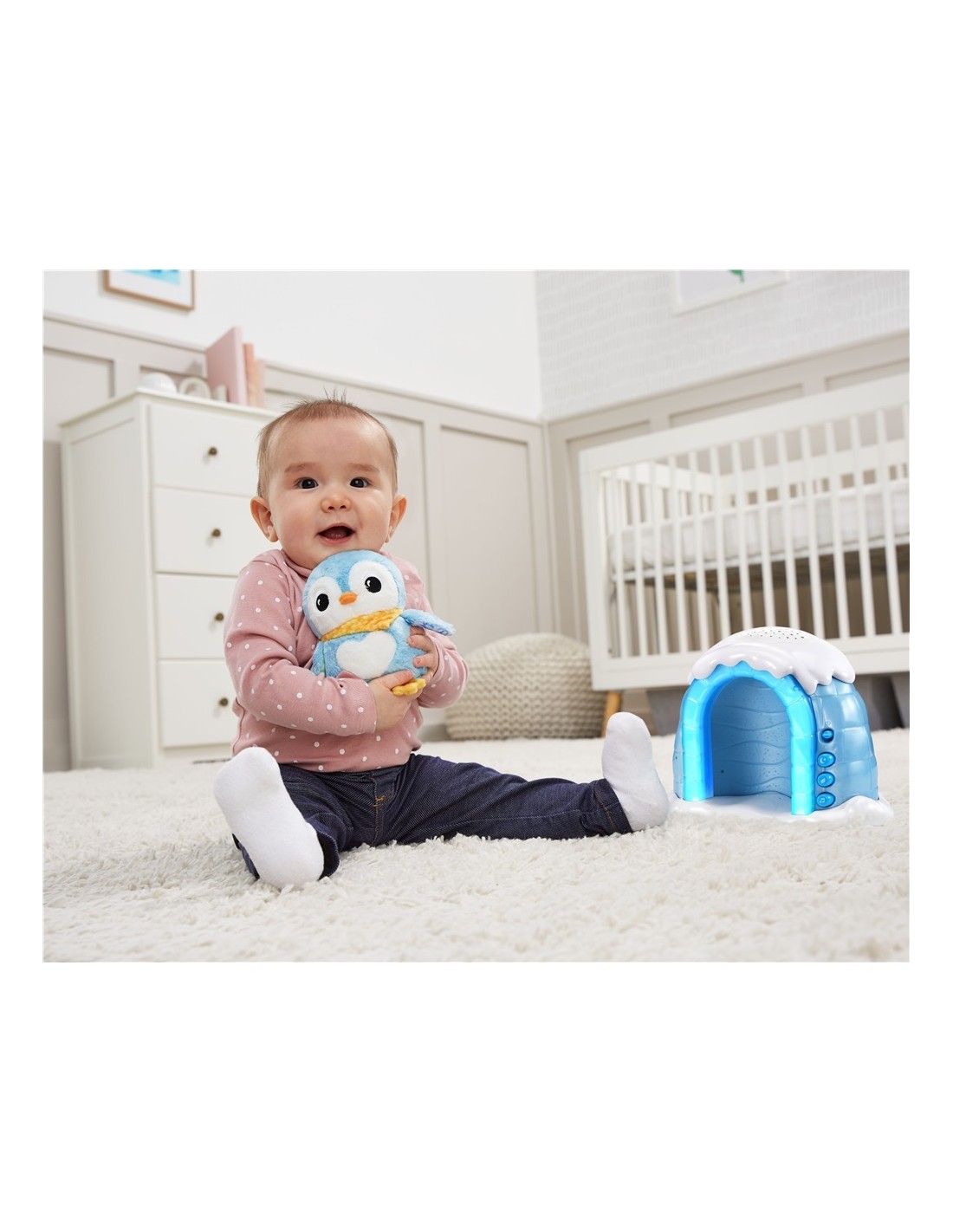 - Proyector‑peluche iglú 2 en 1 para bebés +0 meses. Luz de noche o cielo estrellado en cuatro colores, con pingüino suave extraíble para abrazar.