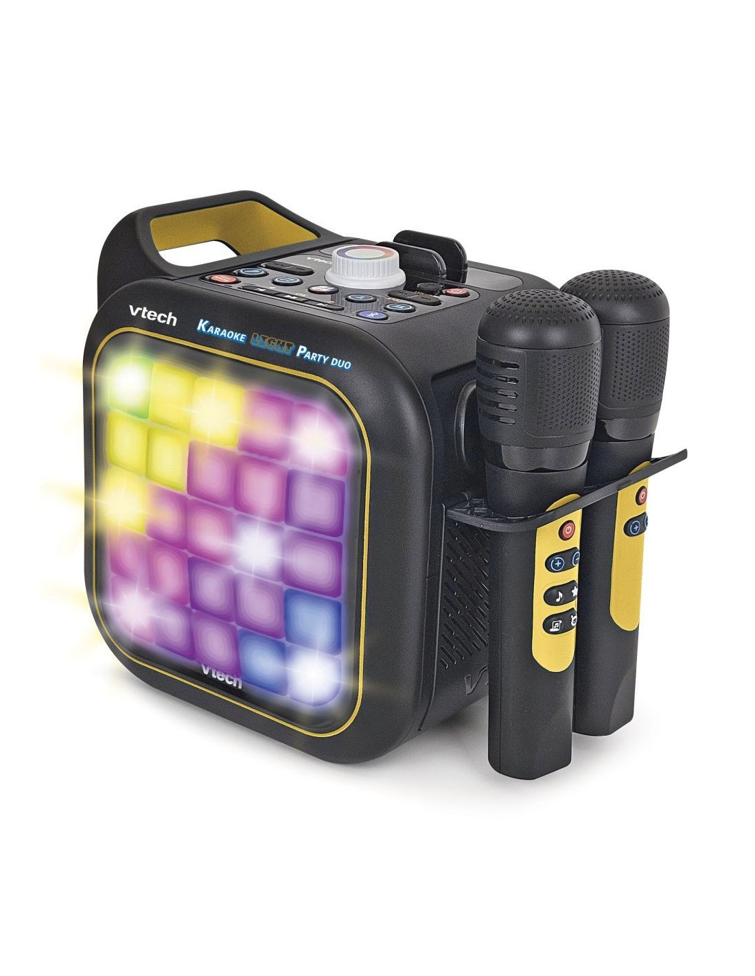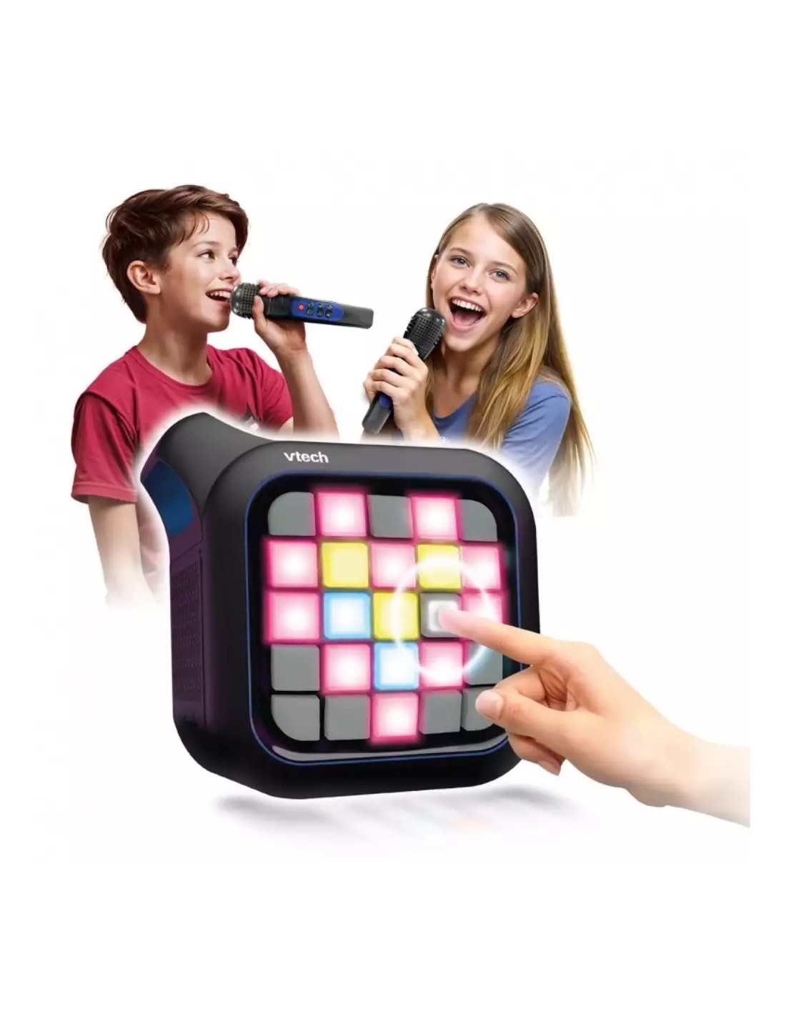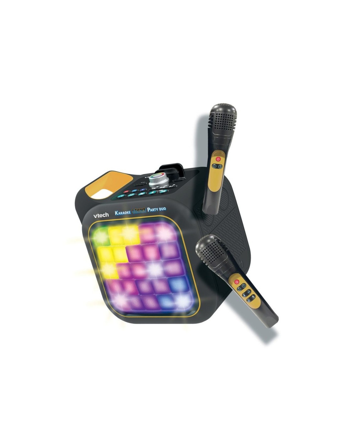 Conecta y escucha tu música con Karaoke Light Party de VTech. Este genial altavoz Bluetooth portátil y multifuncional cuenta con dos micrófonos inalámbricos. ¡Usa los micrófonos para cantar tus canciones favoritas o canta con las canciones integradas y añade divertidos efectos de voz! Incluye 8 emocionantes juegos para 1 o 2 jugadores para practicar y mejorar tu canto, además de otros juegos como una versión del juego retro Snakes. En la parte frontal del altavoz hay 25 botones de píxeles. Gira el dial de color y pulsa cada botón para crear hasta 10 pixel arts únicos y observa cómo bailan al ritmo de la música. En el modo música, configura las luces para que suenen y crea un relajante espectáculo de luces, ¡o luces divertidas para una fiesta! ¡Convierte cada fiesta de karaoke en una fiesta de karaoke con luces!