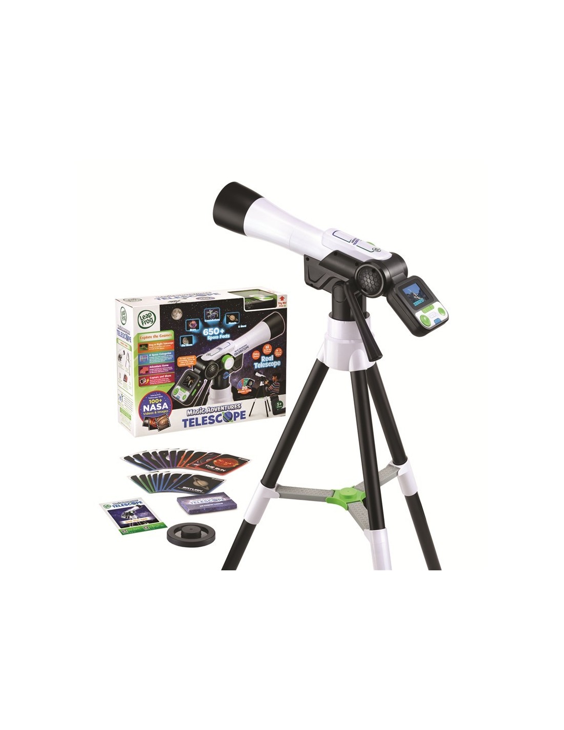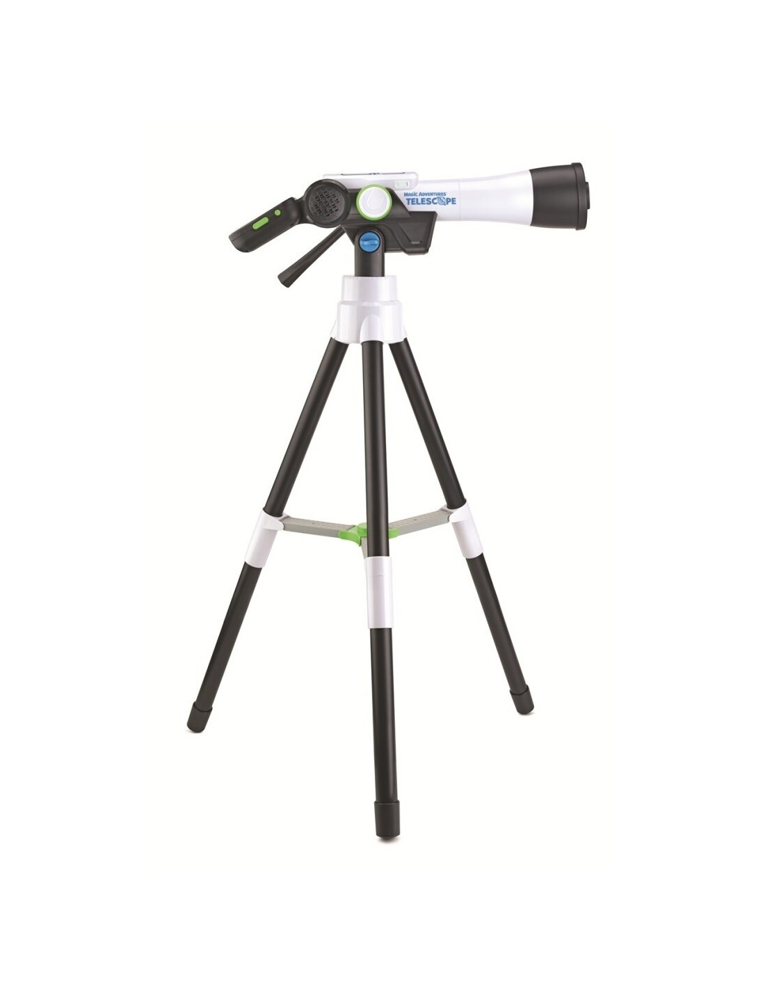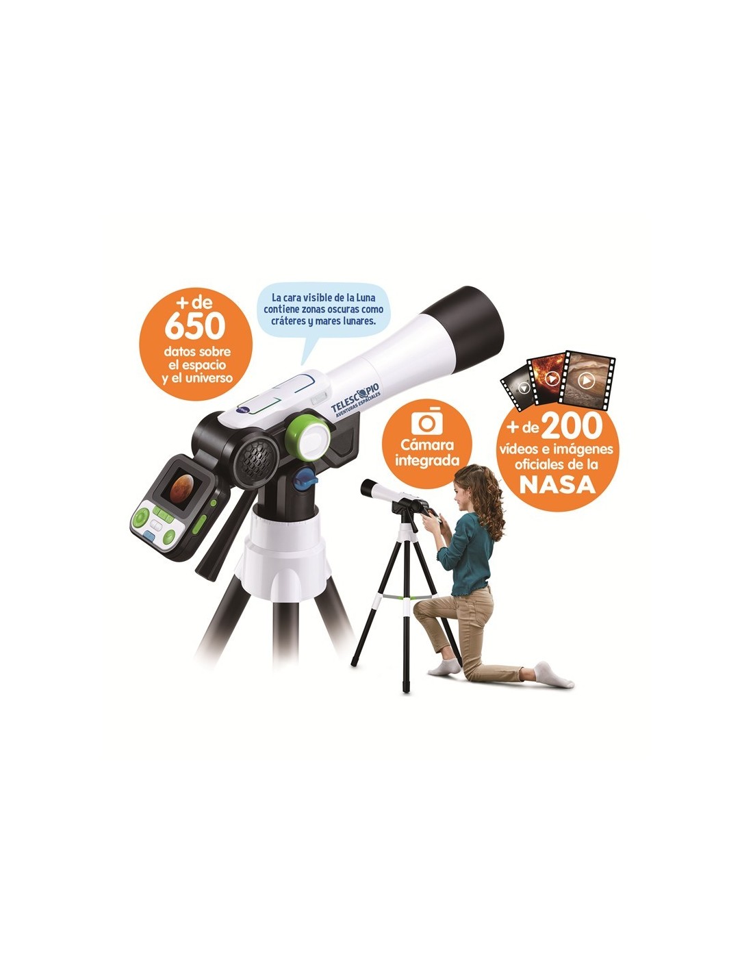 Trípode desmontable, telescopio con foco y tapa, y dial de enfoque, manivela de nivelación, clavija de ajuste de ángulo de visión, compartimento para tarjeta microSD (no incluida) y pantalla LCD a color de ajustable con botones de Zoom y botones para interactuar con juego.