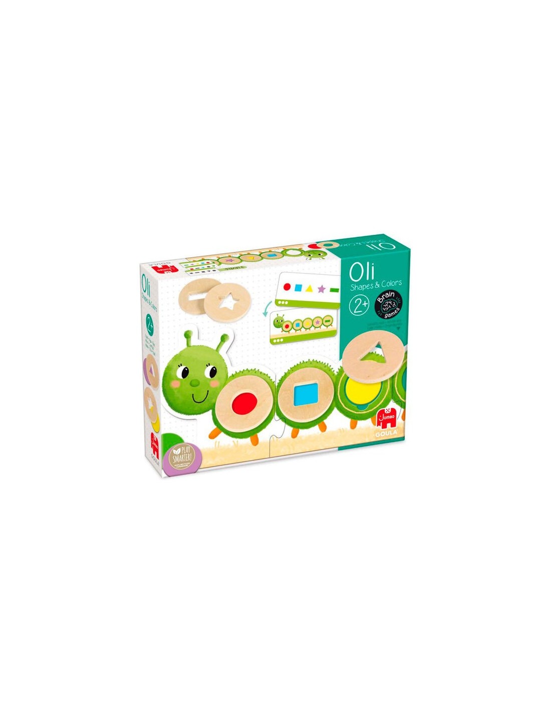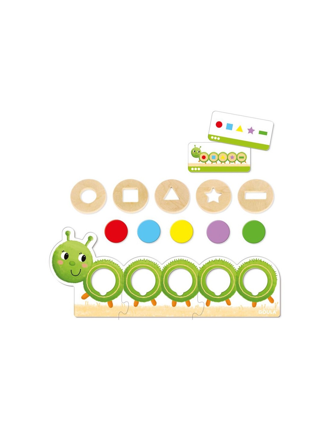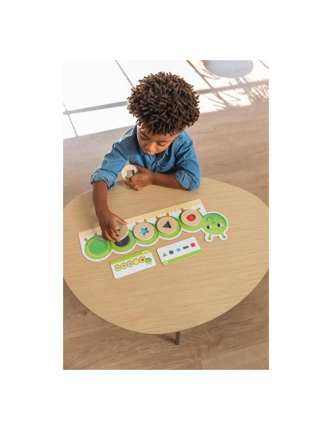 Juego preescolar en el que los pequeños tienen que completar la oruga siguiendo la secuencia de colores y formas que se muestra en las tarjetas. En el dorso de las tarjetas encontraremos la solución. Las cartas de desafío tienen tres niveles progresivos para ir avanzando de dificultad: Nivel 1: solo jugamos con las formas geométricas. Una vez montada la oruga, las fichas redondas se colocan en la oruga por el lado gris. Nivel 2: en este nivel se incorpora el color de las fichas, se tienen que colocar correctamente color y formas geométricas. Nivel 3: esta vez se juega con las fichas decolores: amarillo, rojo, azul, verde y lila y con las piezas de madera.
