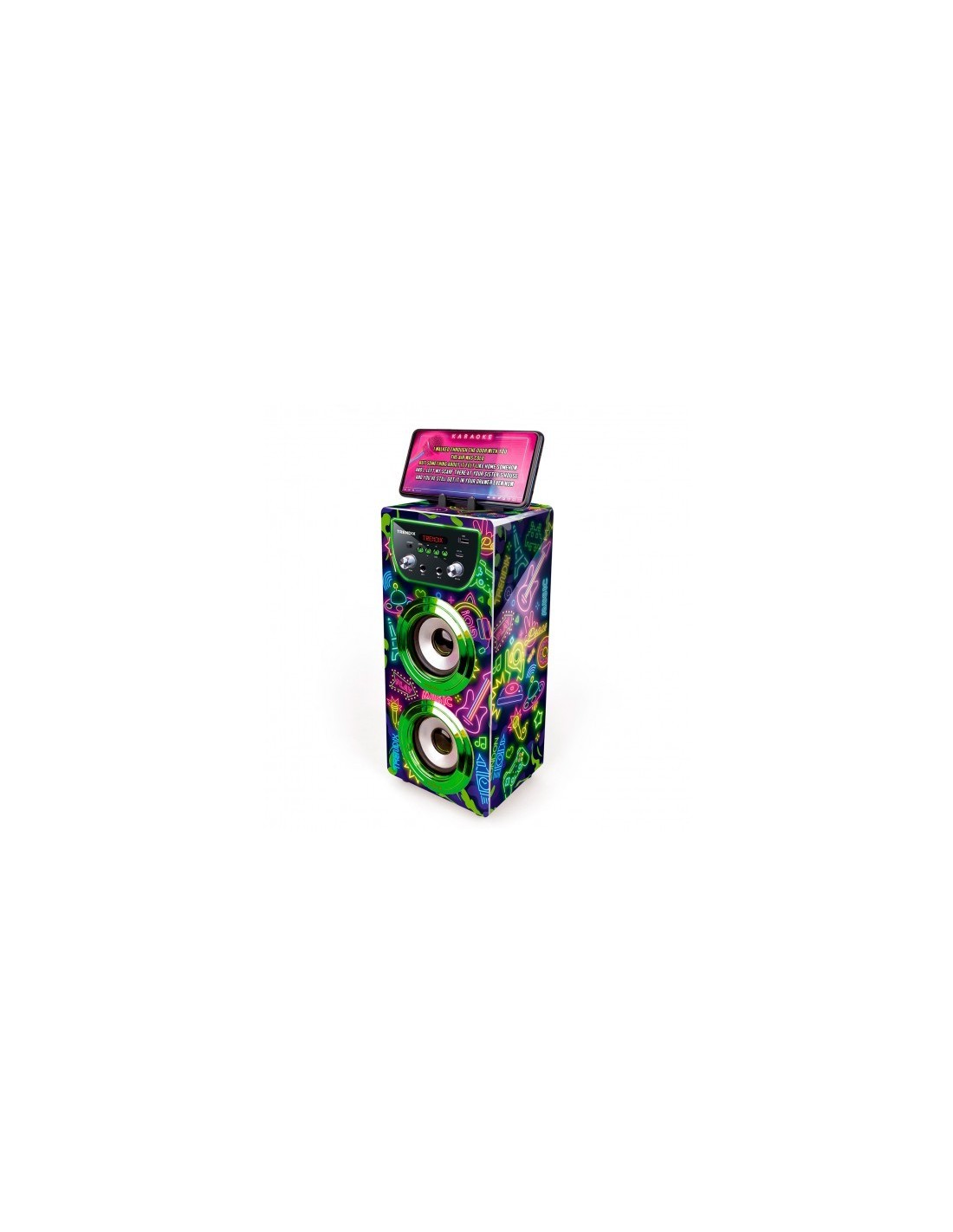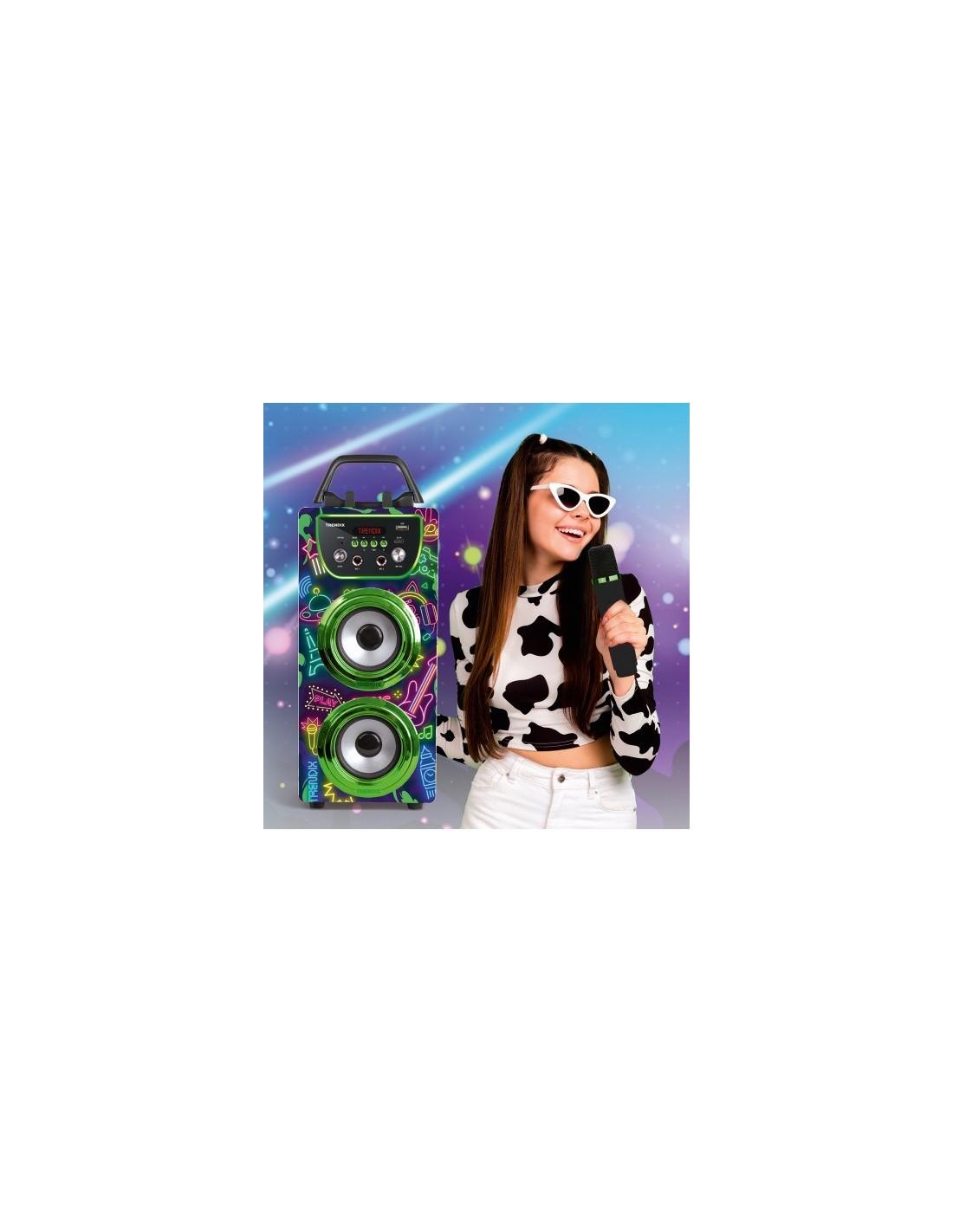 ¡Canta, baila y diviértete como nunca! Este increíble altavoz con karaoke, incluye dos micrófonos inalámbricos con los que podrás distorsionar tu voz, un asa para llevarlo fácilmente, completa pantalla Display, base para apoyar tu móvil y ranuras para USB y Micro SD, Radio FM y Bluetooth. Y además, ¡la diversión está asegurada con la bola de discoteca con luz que iluminará toda la estancia!