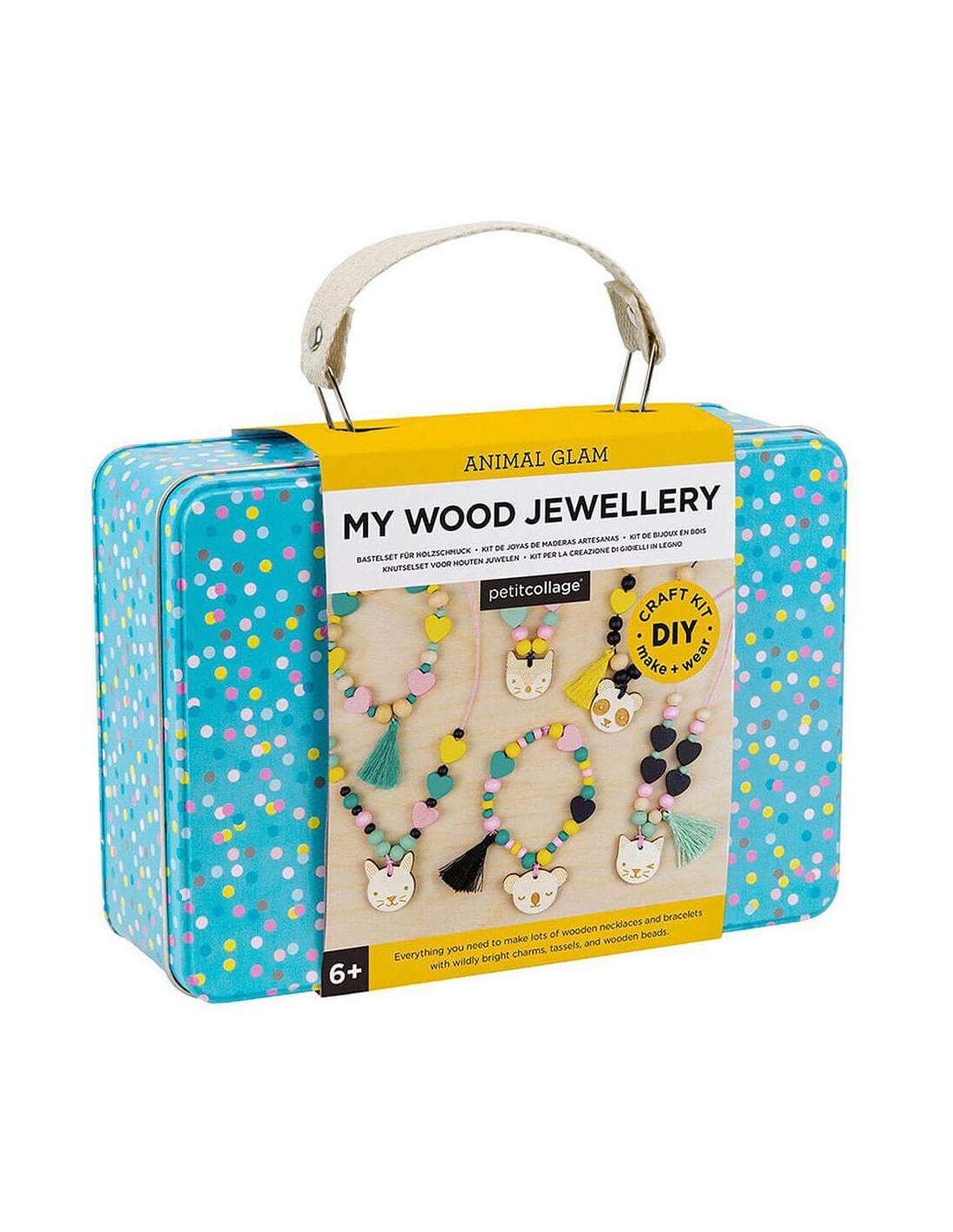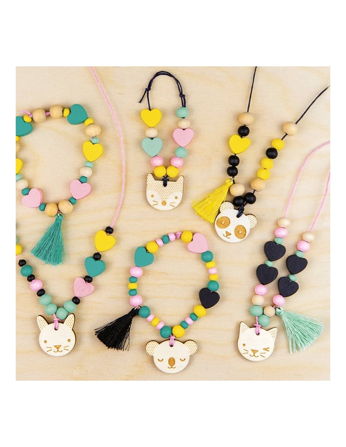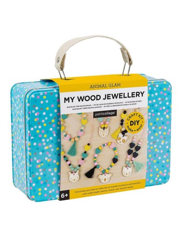 Kit de bricolaje con todo lo necesario para crear collares y pulseras con adornos, borlas y cuentas increíblemente brillantes. Presentado en un bonito maletín metálico con cierre y asa para facilitar su transporte, que podrás utilizar para guardas otras cosas. Incluye: 120 cuentas de madera, 25 corazones, 5 borlas, aguja segura, 5 naimales grabados en laser e instrucciones
