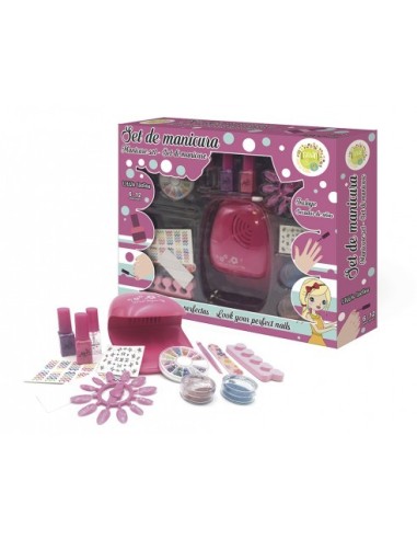 Kit de Manicura que incluye Secador de uñas con funcionamiento a pilas. Juego de imitación de belleza para maquillar uñas a la moda con diferentes accesorios como purpurina, brillantes adhesivos para uñas, lima, separador de dedos, uñas postizas y palito reparador de imperfecciones. Se presenta con dos colores diferentes más un acabado en brillo, dos tipos de purpurina, 12 colores de brillantes adhesivos y más de treinta dibujos para pegar. Con este kit las uñas lucirán perfectas.