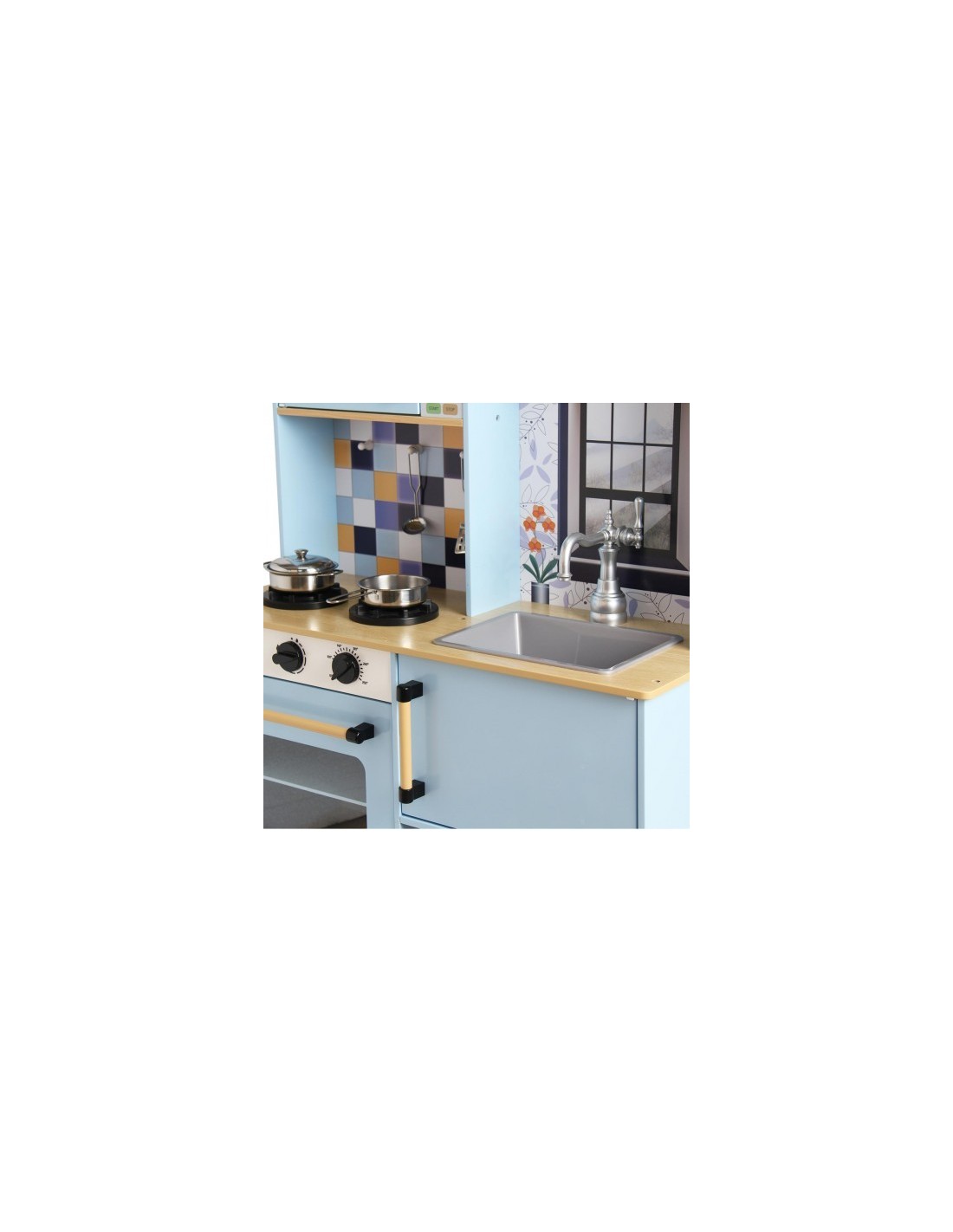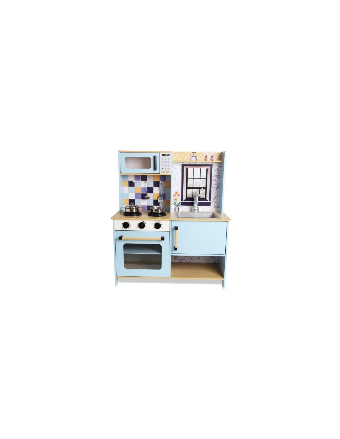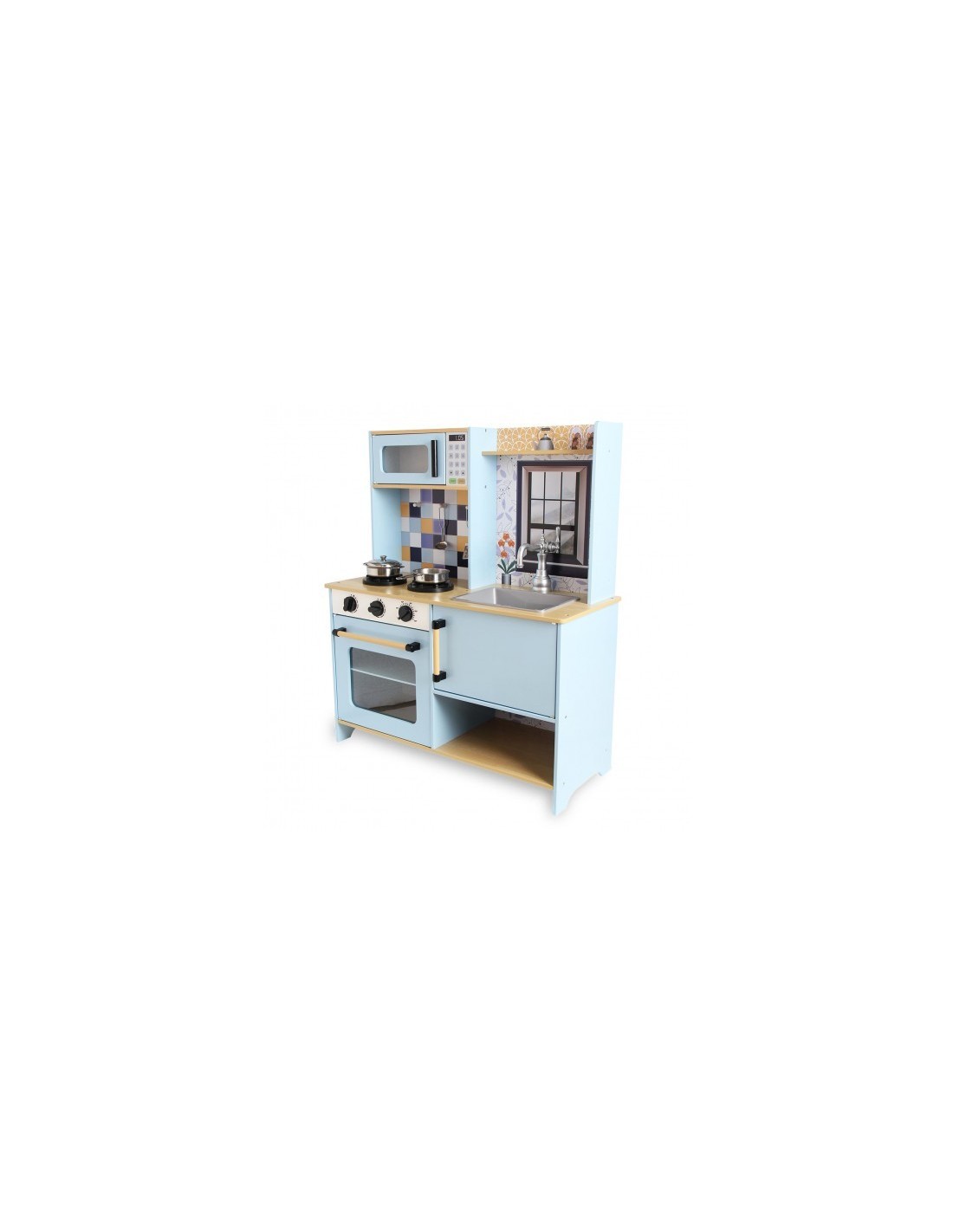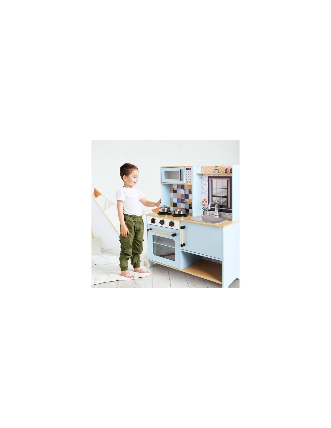 Cocina de madera de calidad premium 72x30x84cm . Cocina de dos módulos con una estética más moderna y minimalista. Con Luz y sonido en la vitrocerámica. Contiene fregadero, microondas, horno, 4 utensilios metálicos, etc. Diseño único y moderno. Recomendado para niños a partir de 3 años. Se requieren 2 pilas AA/LR6, no incluidas.