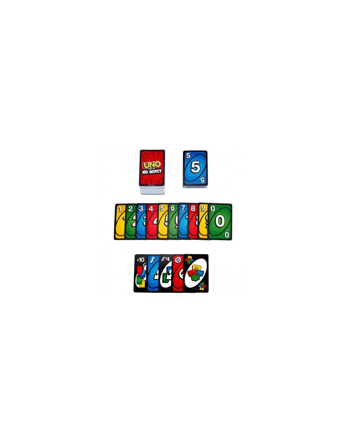 ¡El juego UNO Show 'em No Mercy incluye 56 cartas adicionales, reglas nuevas y cartas especiales de lo más despiadadas que hacen de esta versión la edición más brutal hasta la fecha! ¡Las cartas especiales más despiadadas, como Todos pierden el turno y los comodines Roba seis y Roba 10, obligan a jugar sin compasión! Cuantas más cartas tengas, menos piedad tendrán tus oponentes.
