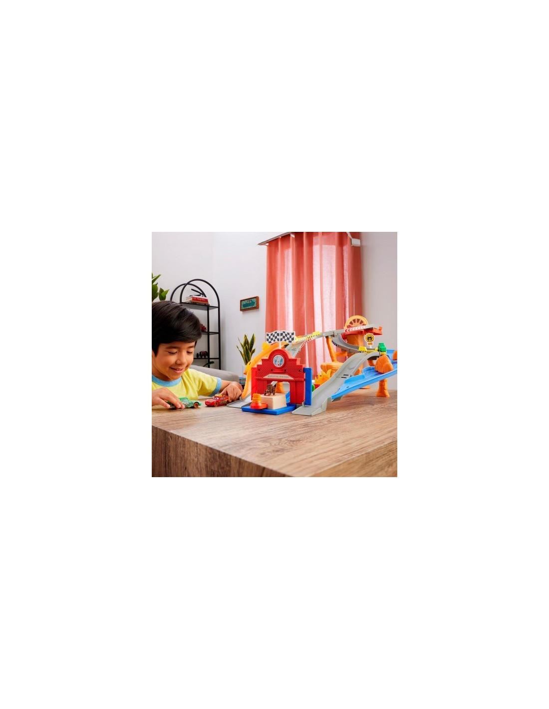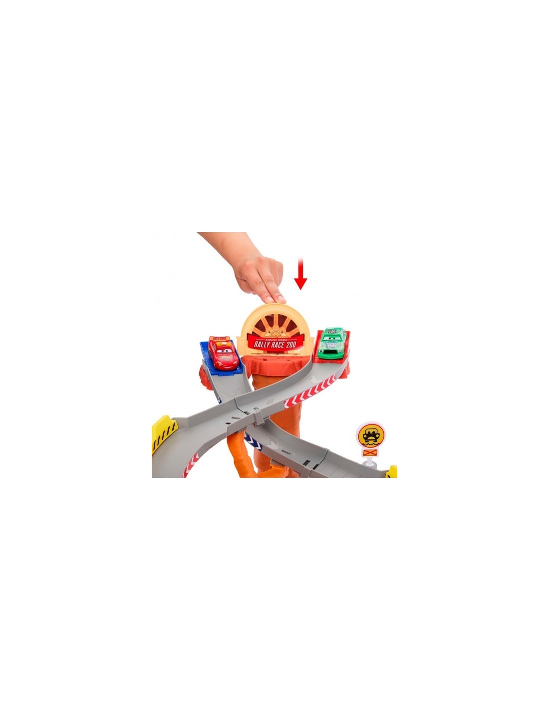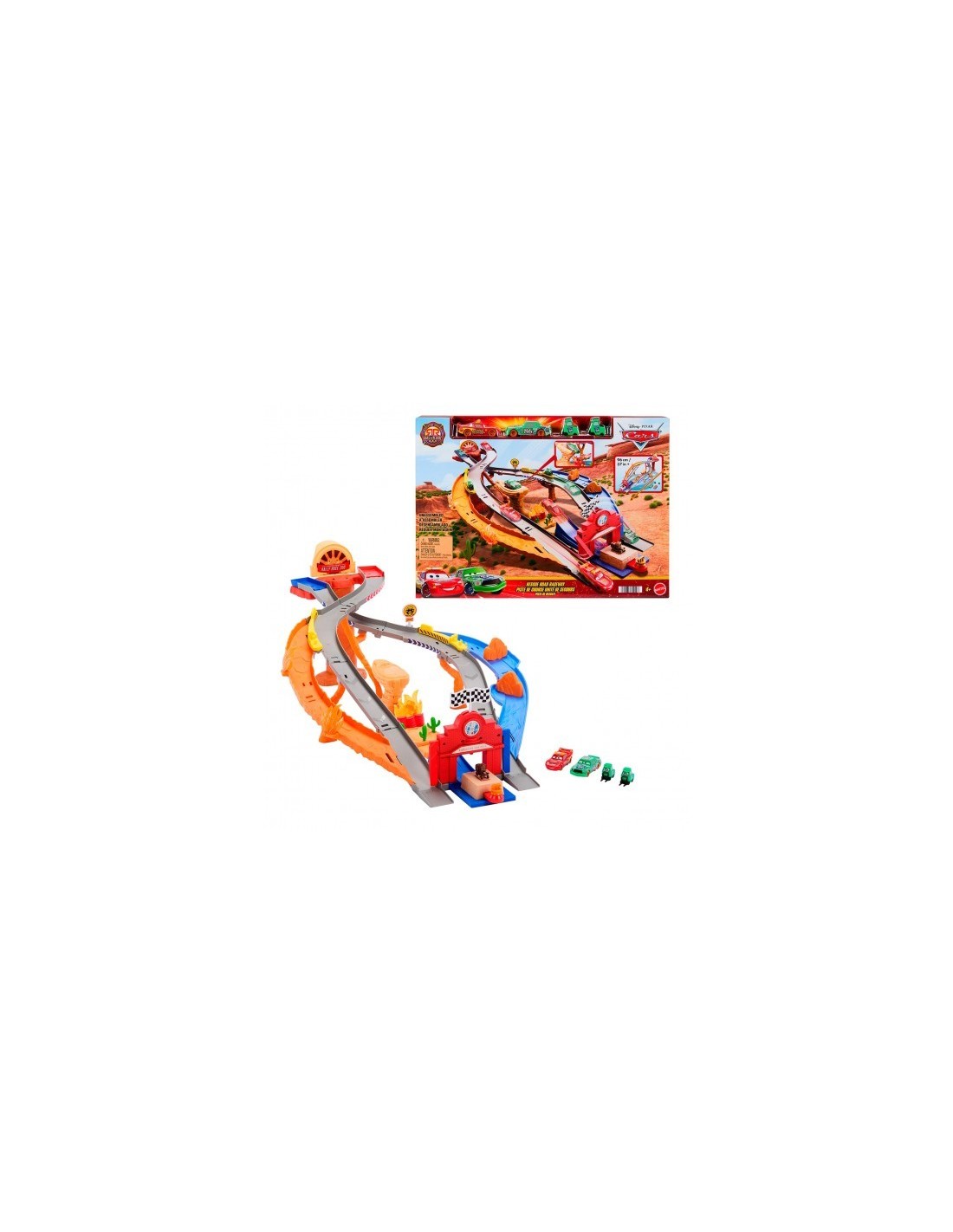 Rayo McQueen se enfrenta a Chick Hicks y sus Pitties en el conjunto Circuito de carreras de rescate de Radiador Springs de Disney Pixar Cars. Este enorme conjunto presenta dos formas de jugar, lo que inspira historias creativas con los personajes favoritos de los fans en un entorno familiar.