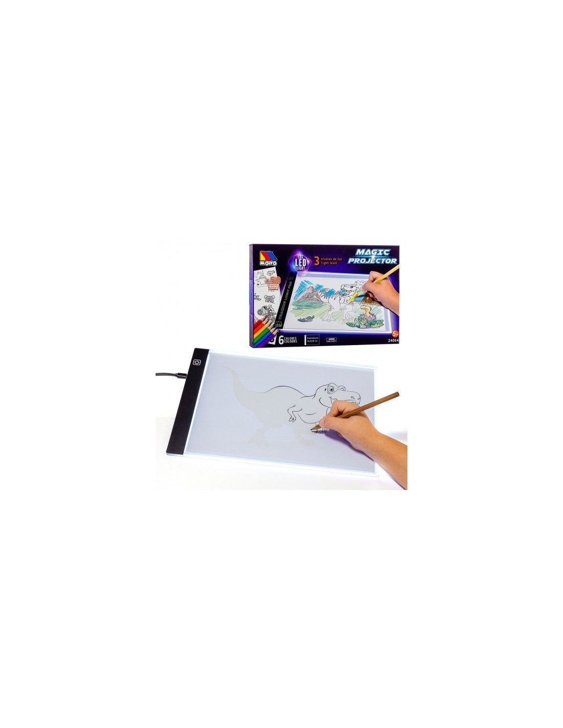 Proyector mágico para hacer muchos dibujos. Tiene 3 luces led diferentes, 6 lápices de diferentes colores y muchos dibujos.