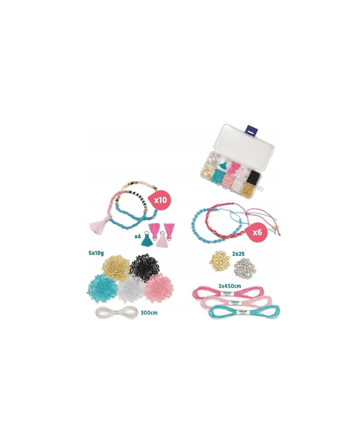 ¡Imagin'Style permite a los niños desarrollar su creatividad, concentración y agarre mientras se divierten! Los niños desarrollan su destreza y aprenden sobre la creación artística de moda. El paquete incluye 16 pulseras (6 tejidas y 10 con cuentas), cuentas y borlas para decorar, 3 colores de hilo y una caja para guardar cuentas.