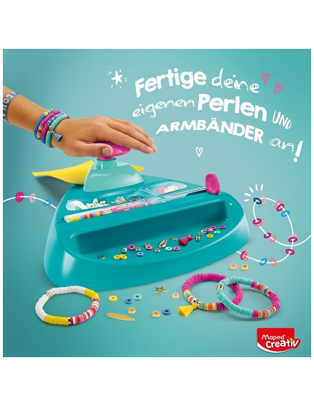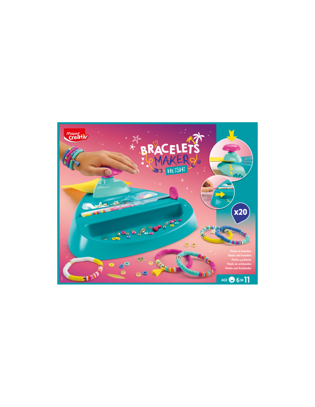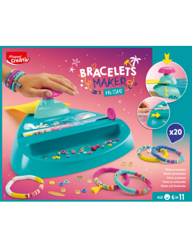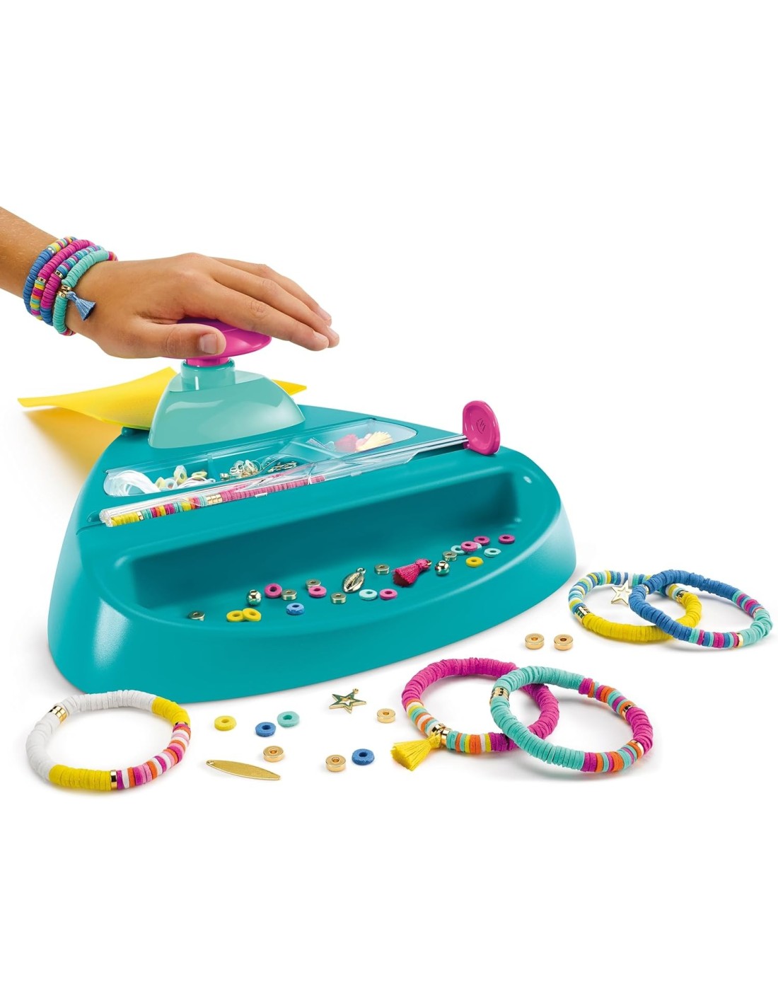 Una máquina de joyería para que nuestros pequeños amigos creen hermosas pulseras. ¡A los niños les encantan las actividades de creación de joyas! Con la Máquina para Hacer Pulseras, descubre una máquina para crear pulseras modernas y las perlas Heishi que las conforman. ¡Crear tu propio estilo ahora es pan comido! Los niños crean 20 pulseras modernas y coloridas por sí mismos. Con la máquina para hacer pulseras, crear pulseras nunca ha sido tan fácil. Los niños comienzan creando cuentas de espuma EVA usando la parte frontal de la máquina. Deslizan la lámina en el espacio reservado, presionan el botón y cortan las cuentas con el sistema de perforación. ¡Pueden crear más de 1500 cuentas! Luego, recogen sus perlas y las colocan en el área de ayuda para la creación. Este espacio permite colocar las cuentas en el orden deseado y sujetarlas para que no se muevan. Solo tienes que enhebrar la aguja, pasar el hilo por las cuentas, atar la pulsera, ¡y listo! Los pompones y otras cuentas doradas añaden un toque de encanto a las pulseras. Muy fácil de usar, los diferentes espacios de la máquina acompañan a los niños en todas las etapas de la creación de sus pulseras. Un compartimento con tapa permite guardar cuentas y accesorios. ¡Con la máquina para hacer joyas para niños Bracelets Maker, resultados garantizados! Los niños crean pulseras únicas y a la moda por sí solos. Estarán orgullosos de lucir sus creaciones.