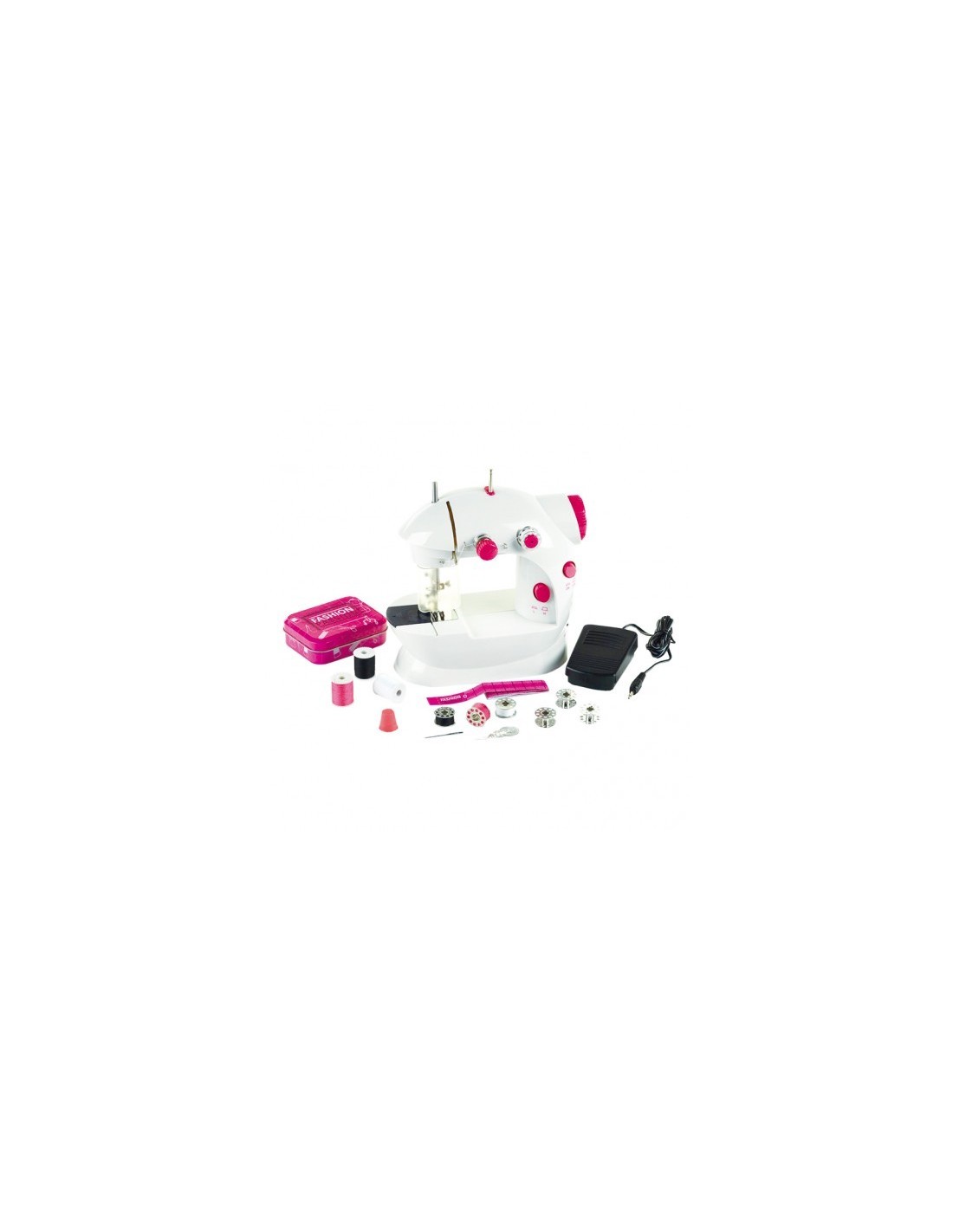 Maquina de coser para niños, para imitar a mamá. Protección de seguridad transparente para la aguja, con hilo superior y inferior, 2 niveles de seguridad, modo manual posible, funcionamiento con pilas, manejo a través del pedal. Ajuste de la tensión del hilo a través del botón giratorio, porta carrete de hilo escamoteable, tensor de hilo superior.