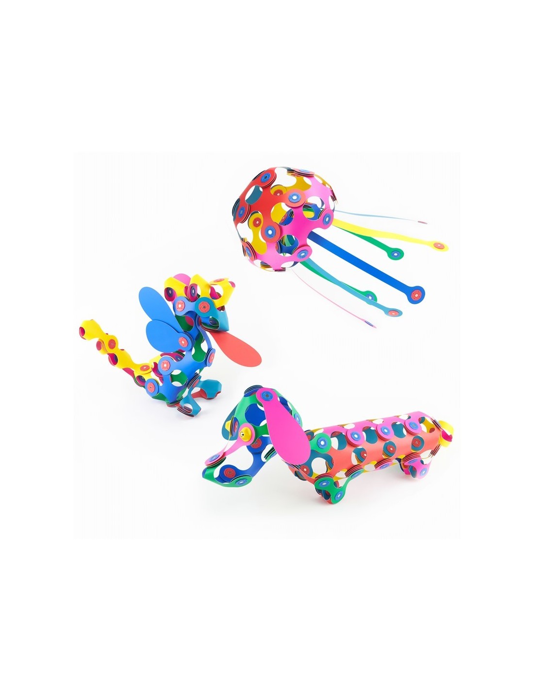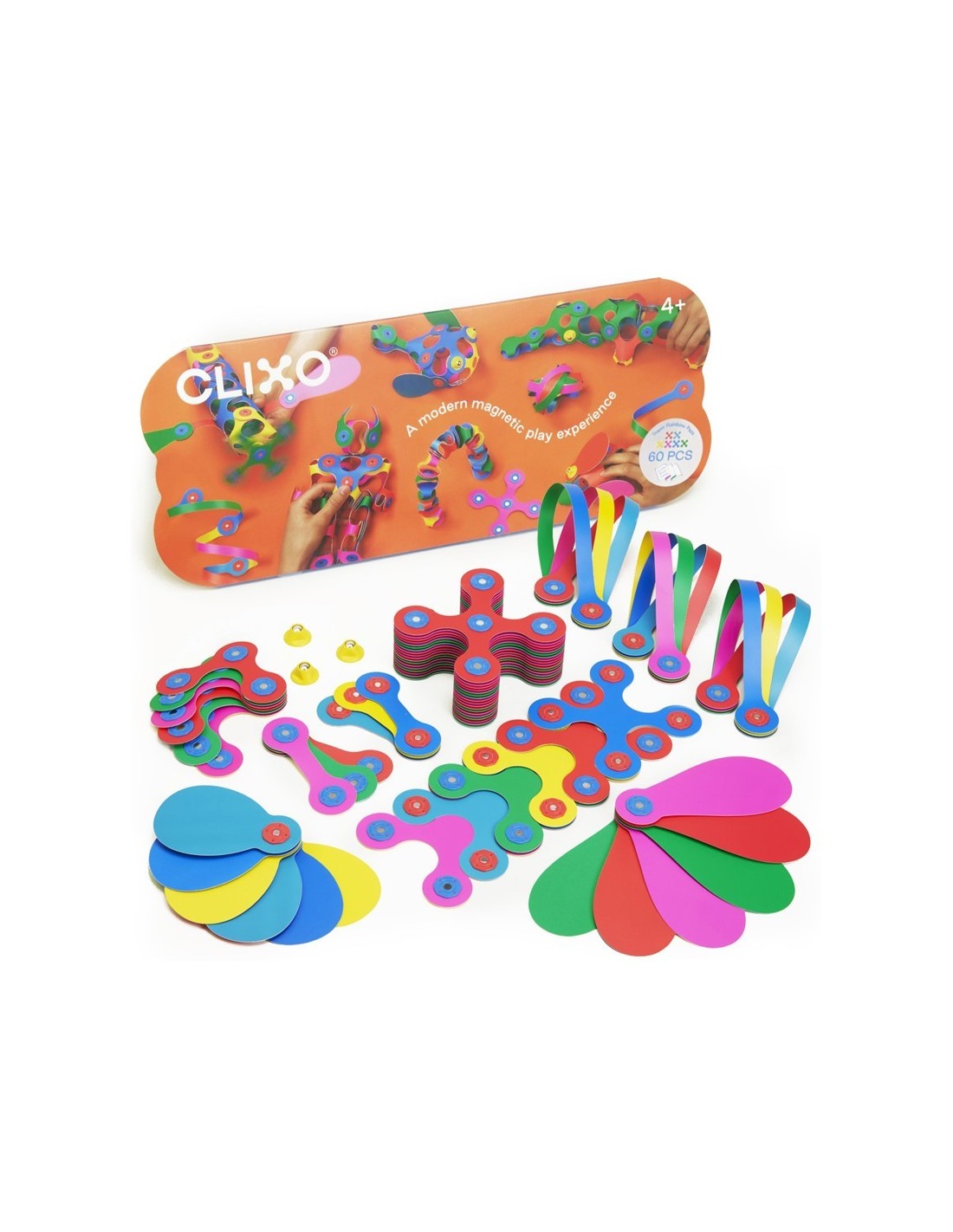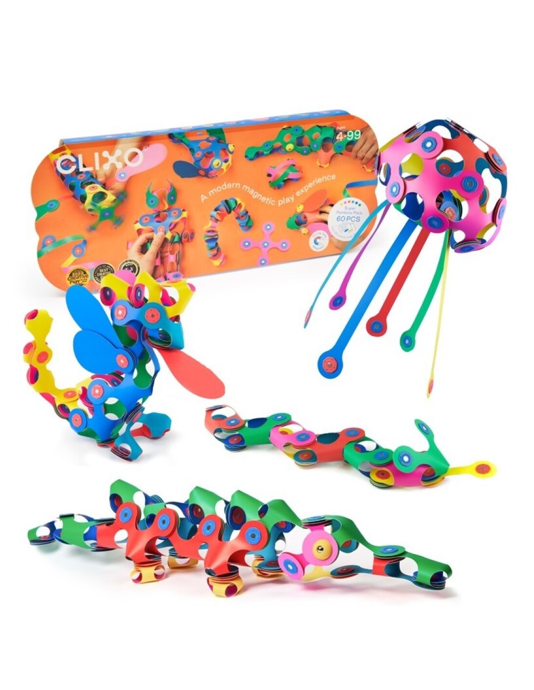Más allá del arcoíris de posibilidades, el Super Rainbow pack con 60 piezas en 8 formas únicas de CLIXO, incluidas 3 piezas giratorias "spinner" para poder montar creaciones que giren sobre sí mismas. el Super Rainbow es un pack muy divertido para toda la familia. Ideal para niños con una imaginación desbordante y lo suficientemente versátil para grupos.