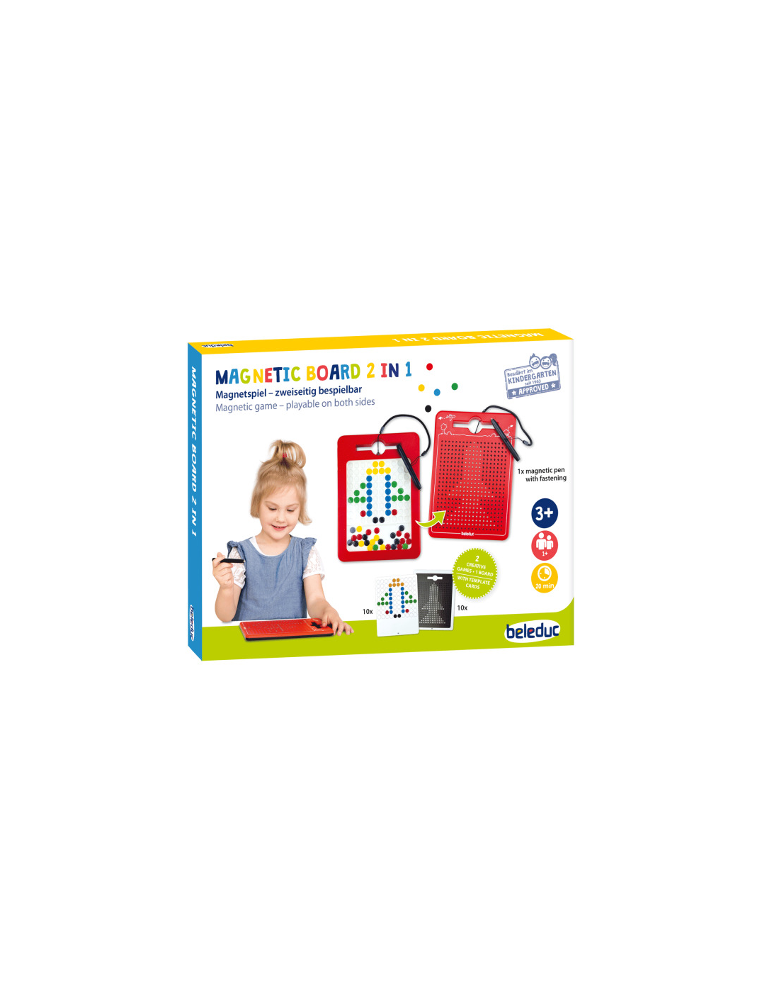 En el otro lado del tablero, los pequeños encontrarán un juego magnético lleno de piezas de colores para componer figuras, patrones e imágenes originales. Dos formas de jugar, un solo juguete… ¡y una creatividad infinita!