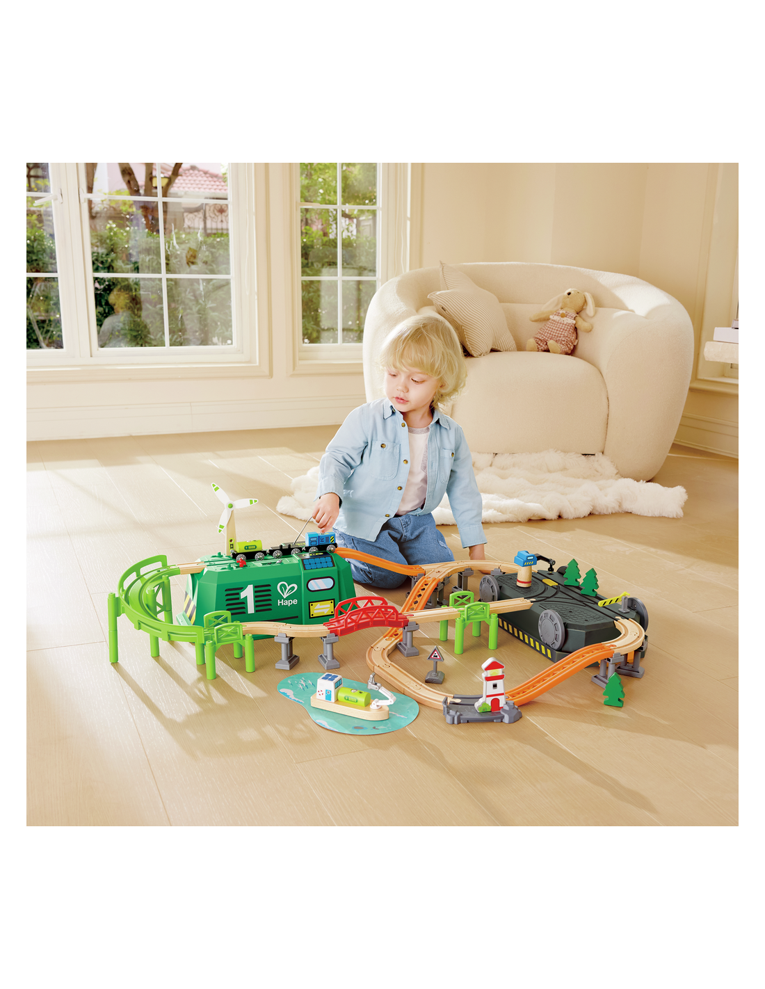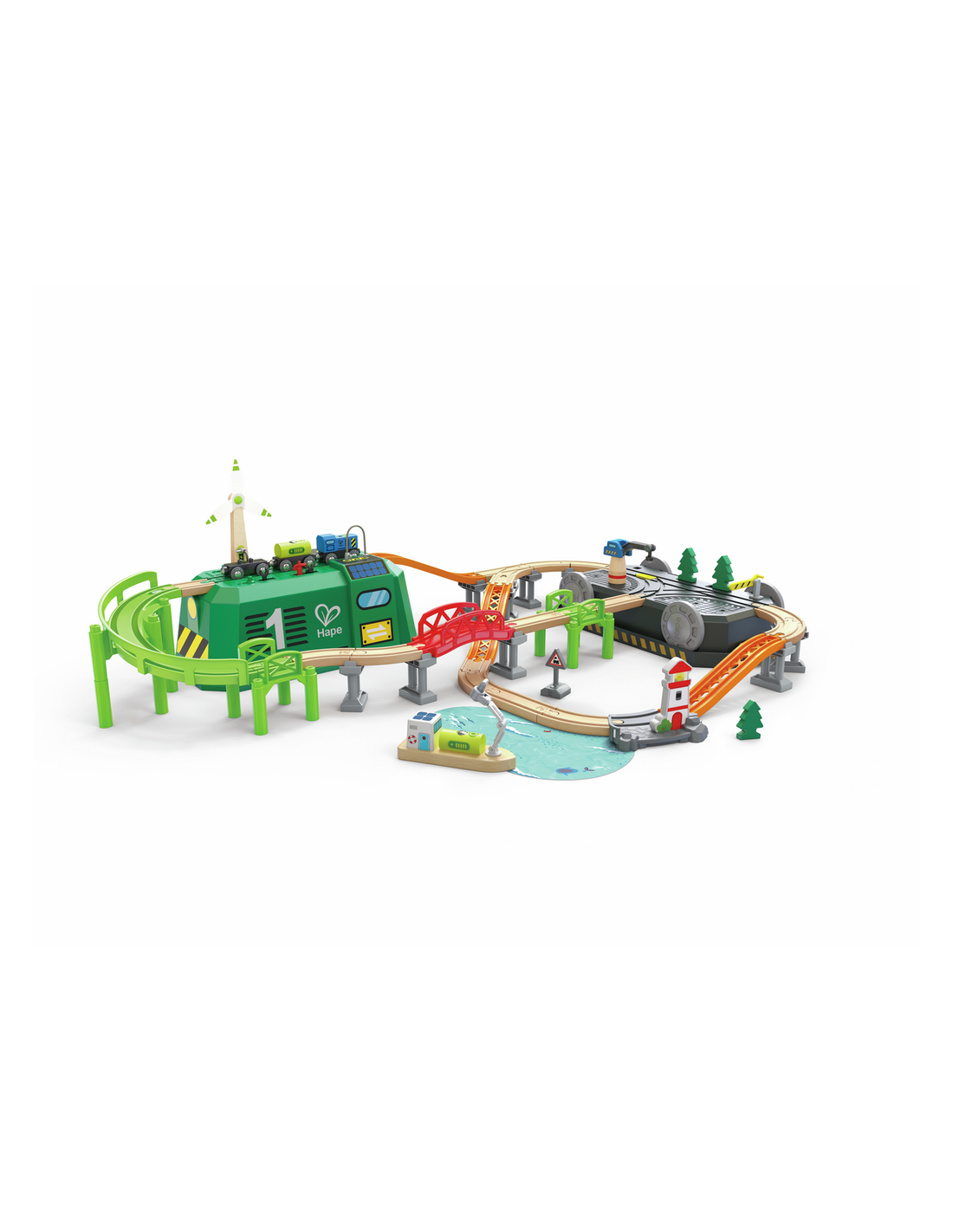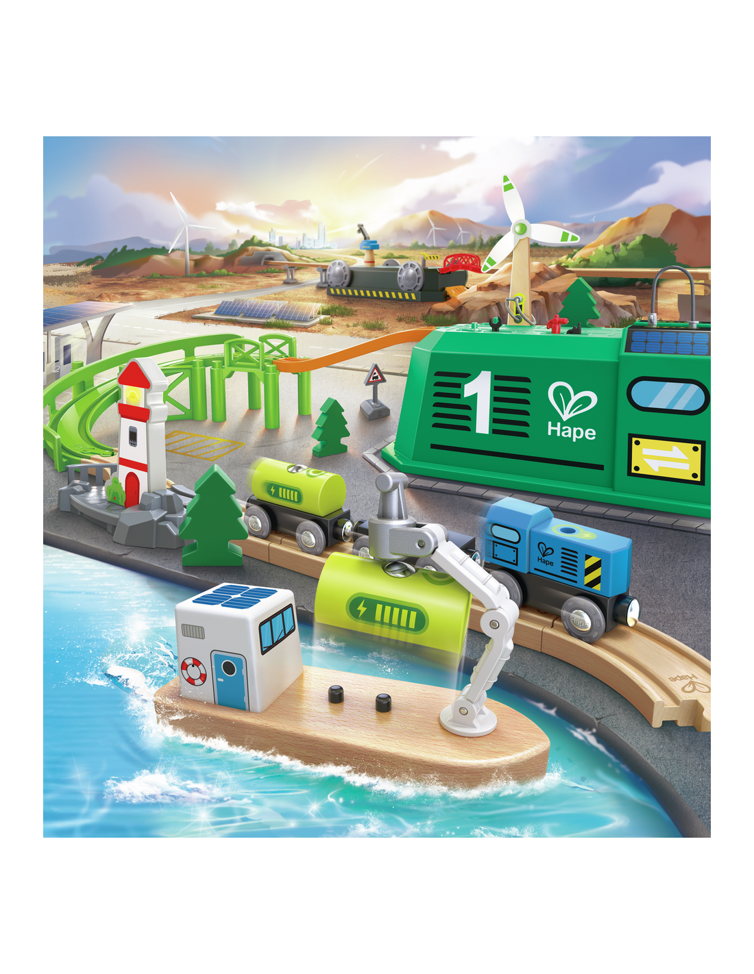 Introduzca a los niños en el mundo de las energías renovables a través de juegos ferroviarios prácticos con el set de tren de energía eco en cubo. Con una caja de almacenamiento en forma de tren con ruedas incorporadas, este set incluye un trazado de vías completo, una grúa, un barco y una estación de carga con energía solar para transportar y repostar la carga ecológica. Compatible con otros sistemas ferroviarios de madera, este set permite a los niños explorar la energía eólica y solar a través de juegos de rol imaginativos, desarrollando la coordinación y la conciencia temprana de STEM.