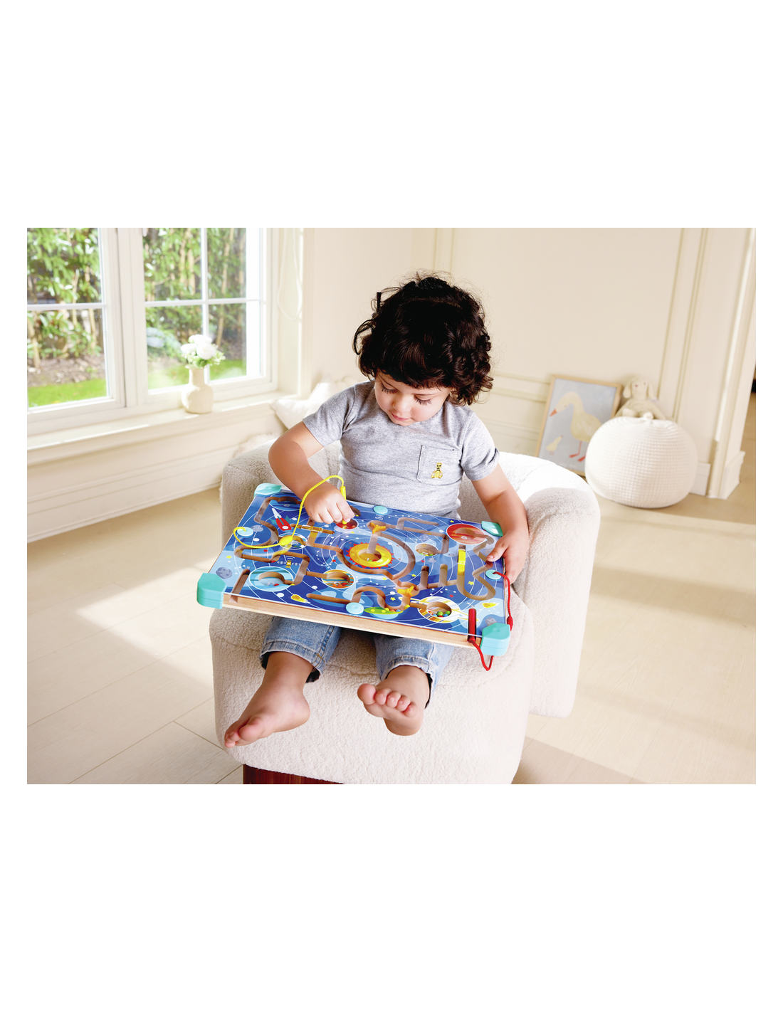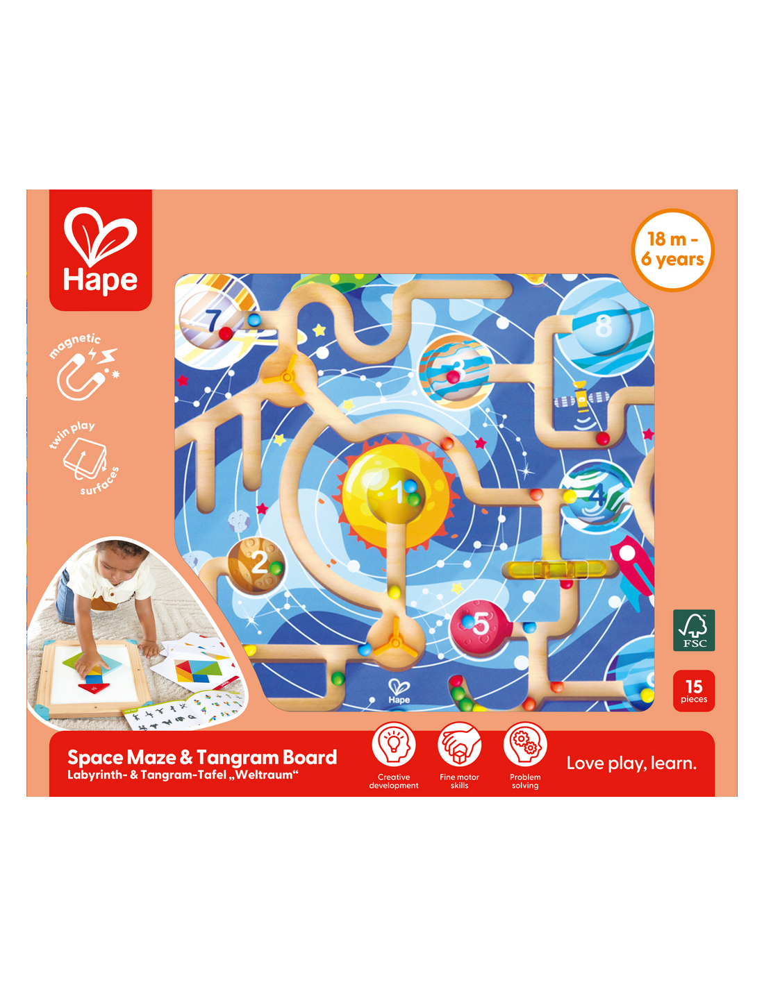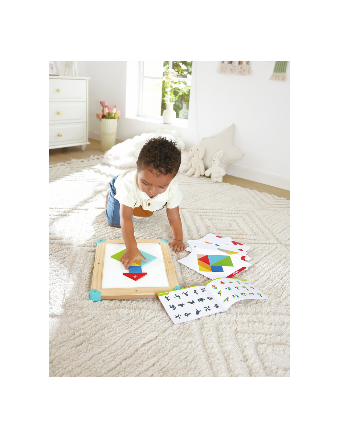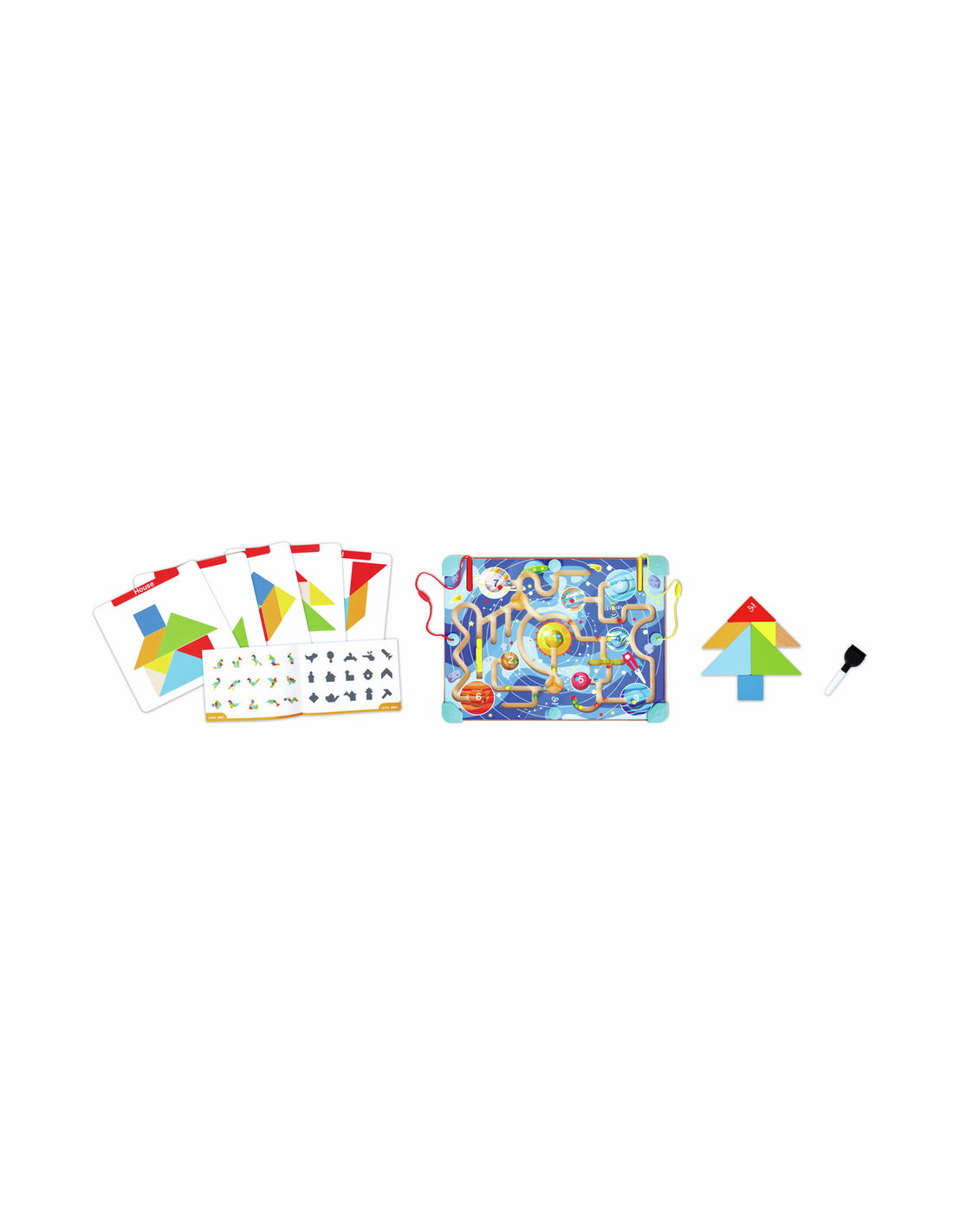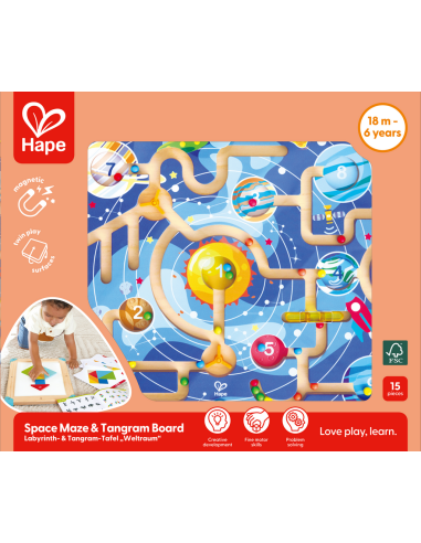 Un tablero de juego interactivo y multifuncional que combina lógica espacial, creatividad y motricidad fina en un diseño compacto. Un lado presenta un laberinto magnético con temática espacial, donde los niños guían cuentas de colores por los recorridos usando un lápiz magnético. Al darle la vuelta, se convierte en un rompecabezas tangram progresivo con una pizarra para dibujar y diseñar. Incluye cartas de desafío y un libro de actividades con 150 tareas, lo que fomenta el reconocimiento de formas, la coordinación mano-ojo y la resolución de problemas, todo mientras los niños se mantienen entretenidos con un juego abierto y creativo.
