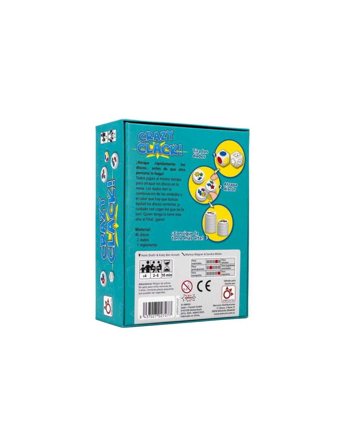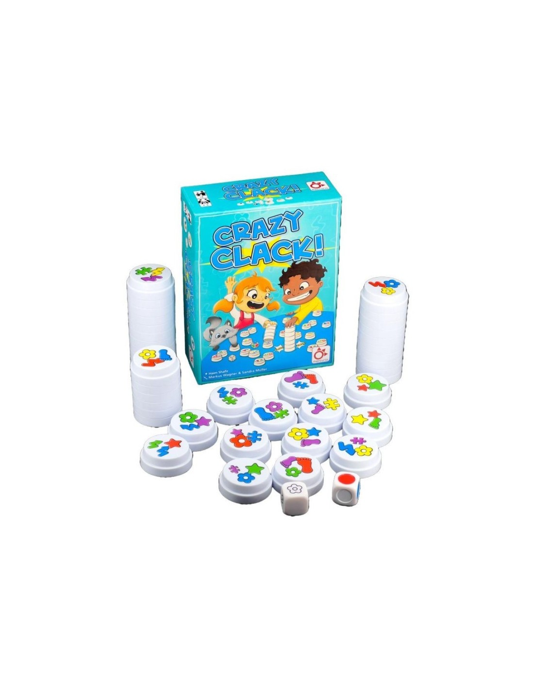 Crazy Clack es un juego dinámico y frenético pensado para los peques. Cada disco combina 3 símbolos con 3 colores distintos. En cada ronda se lanzan los dados que indican qué símbolo y qué color hay que encontrar; todos los jugadores intentan apilar a la vez el máximo de discos que cumplan esa combinación. Al final de la ronda, quien tenga la pila más alta ¡gana!