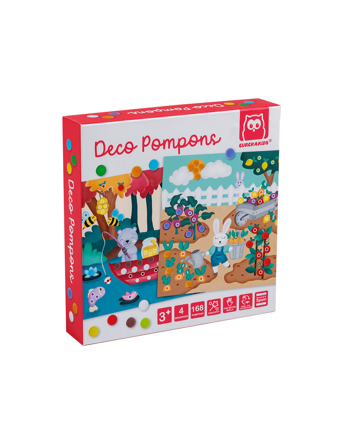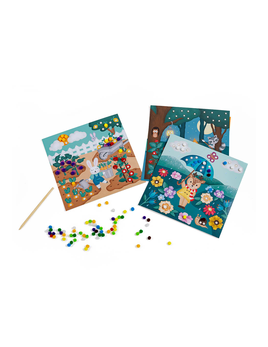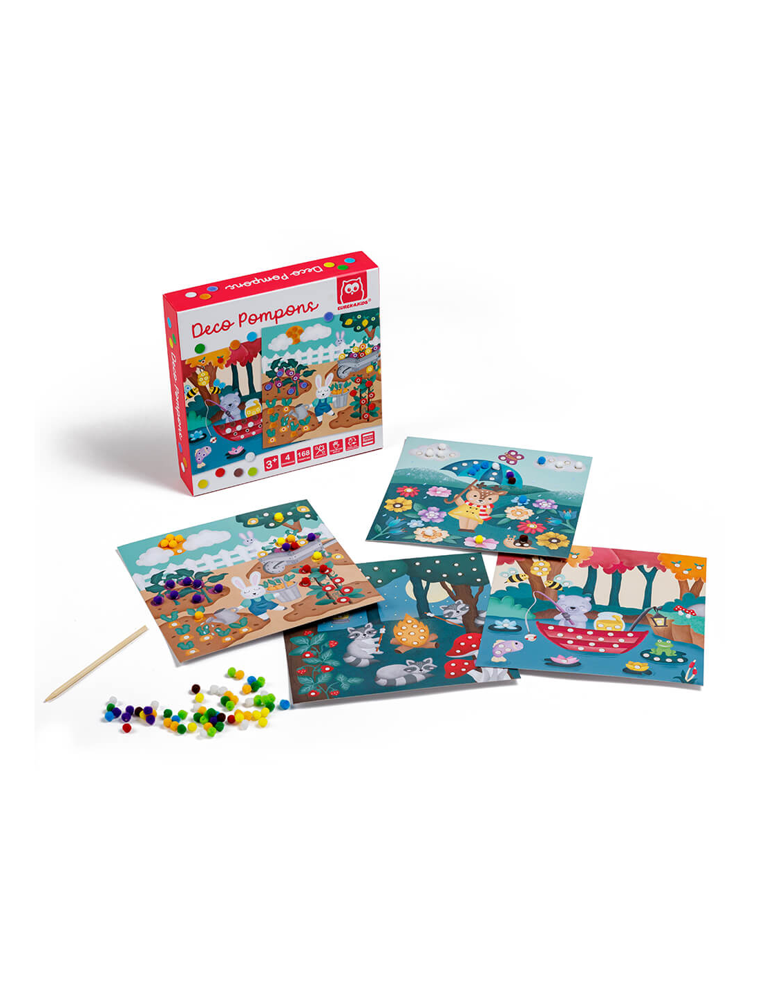 Este juego creativo contiene 4 láminas y más de 150 pompones de 9 colores distintos para decorar y dar vida a las ilustraciones. Su funcionamiento es muy sencillo: deberán utilizar la espátula de madera para retirar los adhesivos de los círculos blancos y utilizar el pompón del color indicado para completar el trabajo. Aunque se puede elegir un pompón de cualquier color, es importante que intenten elegir el color indicado, de este modo se potencia el reconocimiento de los colores y aprenden a seguir instrucciones. Edad: A partir de los 3 años Características: Juego creativo para decorar con pompones. Incluye 4 ilustraciones con escenas de animales, pompones de 9 colores distintos y 1 espátula de madera. Colores vivos, brillantes y contrastados para llamar su atención. Pompones suaves y agradables para activar su sentido del tacto. Actividad muy sencilla de realizar con la que se obtienen unos acabados perfectos.