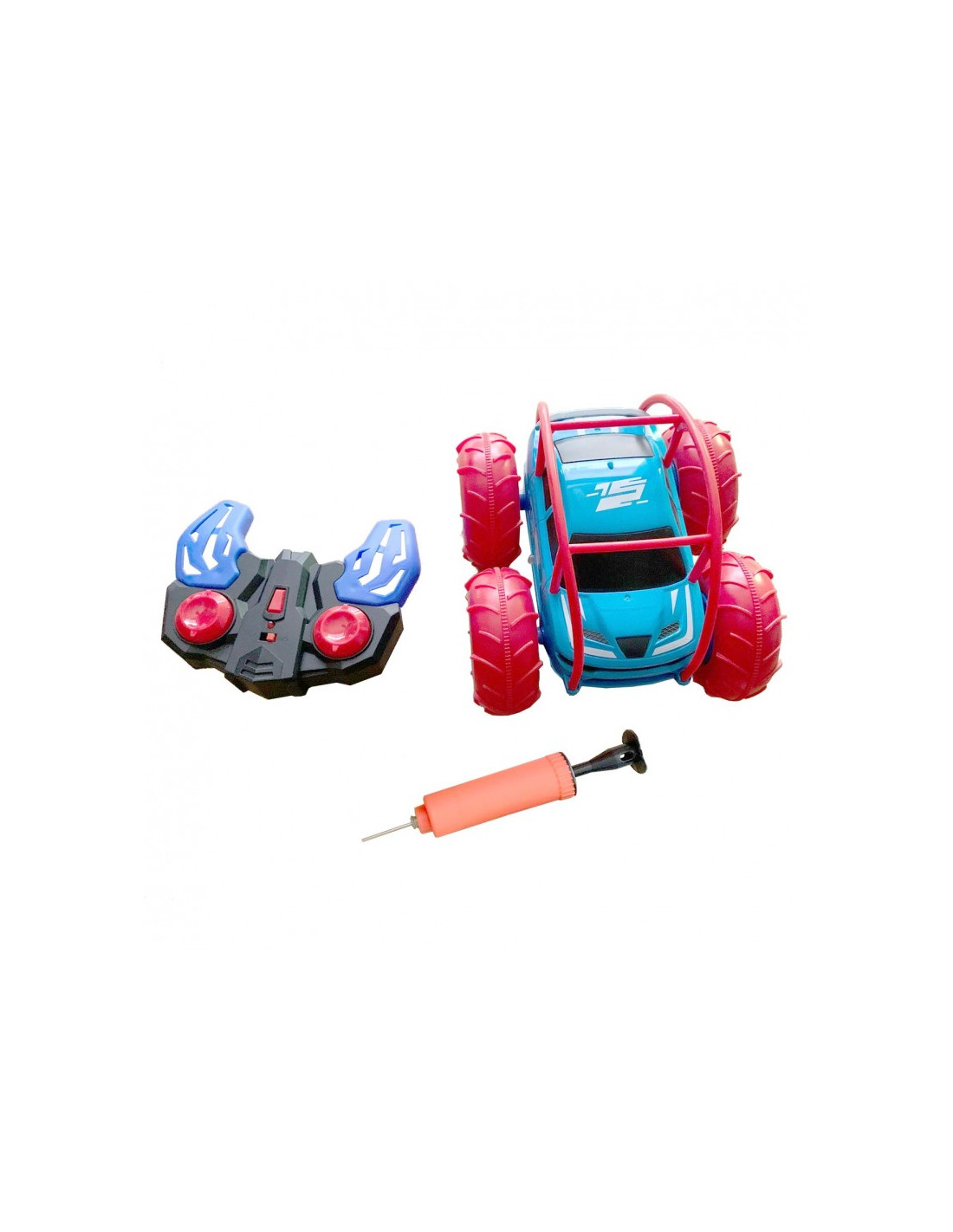 Coche anfibio con ruedas hinchables. Puede ir por tierra o por agua. Efecto rebote y amortiguador con las ruedas hinchables. Incluye hinchador, cargador USB, batería y destornillador. Mando a distancia ligero y ergonómico.