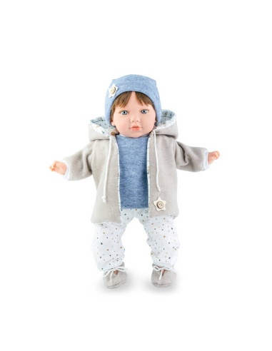 Conoce al dulce Teo, uno de los muñecos de 45 cm de la marca Marina & Pau. Tiene extremidades de vinilo y un cuerpo de tela suave que te encantará abrazar. Su cara es muy adorable y lleva un traje muy lindo. ¿A qué esperas para conocerlo? - Extremidades de vinilo y cuerpo blando . - Los brazos son de vinilo, pero no los hombros. Las piernas son de vinilo, pero no la cadera. - Vinilo con toque especial
