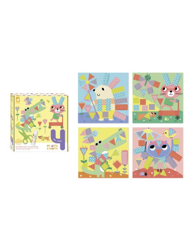 Este estuche creativo tiene todo lo necesario para decorar 4 cuadros con papel con distintos estampados que los pequeños tendrán que cortar y pegar en su sitio. Además, la caja se convierte en un caballete para exponer sus bonitas creaciones. Las tijeras aptas para los más pequeños (solo cortan el papel) y las 5 hojas de papel con estampados permiten a los pequeños artistas dar rienda suelta a su creatividad.