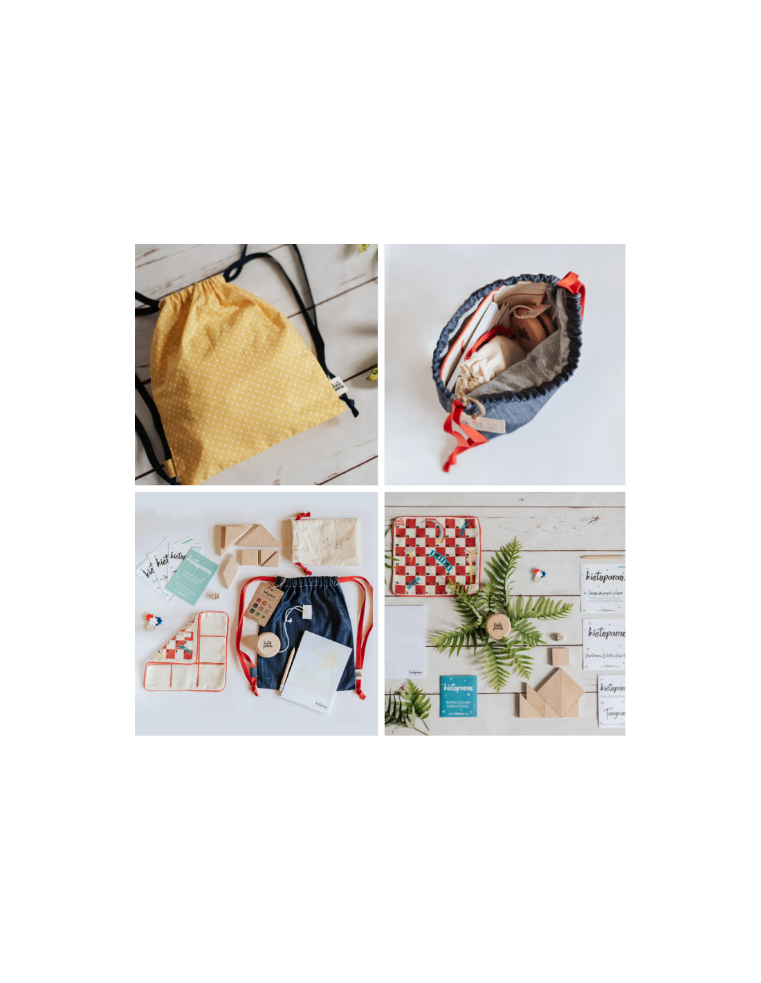 - Una bolsa-mochila que también es un juego en sí mismo. Basado en el método Montessori, podrás jugar a guardar objetos que tengáis cerca y adivinar, con el tacto, qué hay escondido dentro de la bolsa. \n